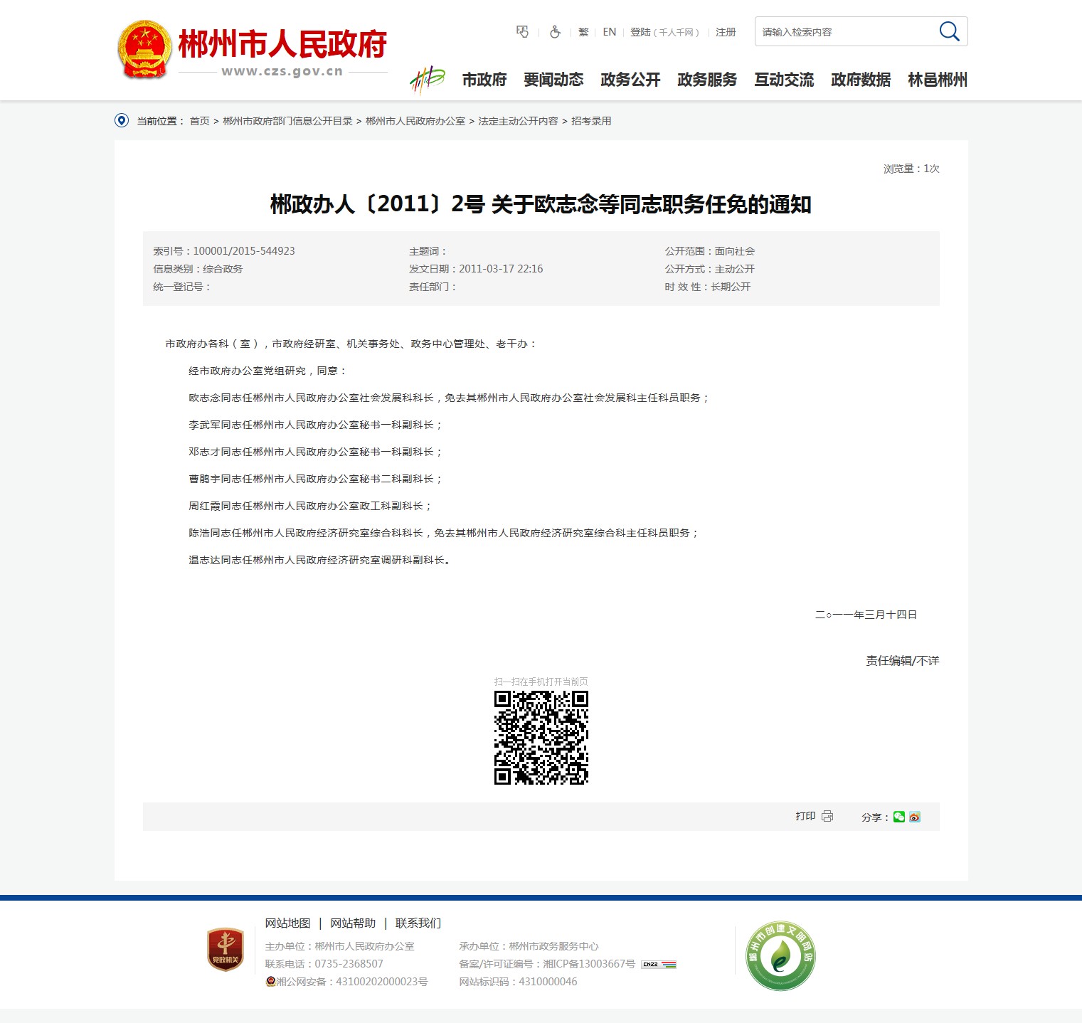 欧志念同志任郴州市人民政府办公室社会发展科科长,免去其郴州市人民政府办公室社会发展科主任科员职务;
