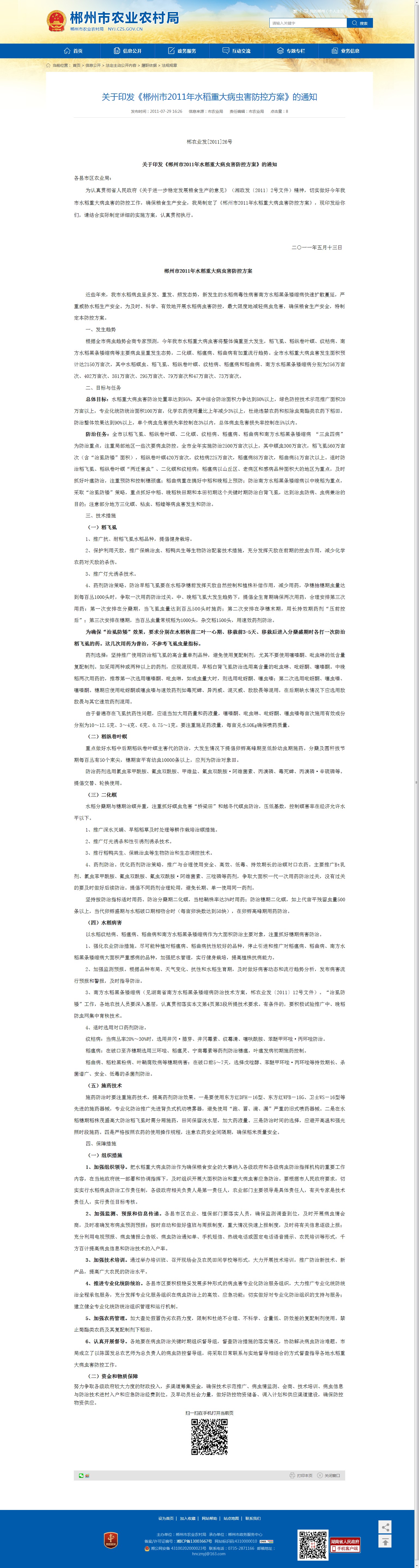 关于印发《郴州市2011年水稻重大病虫害防控方案》的通知