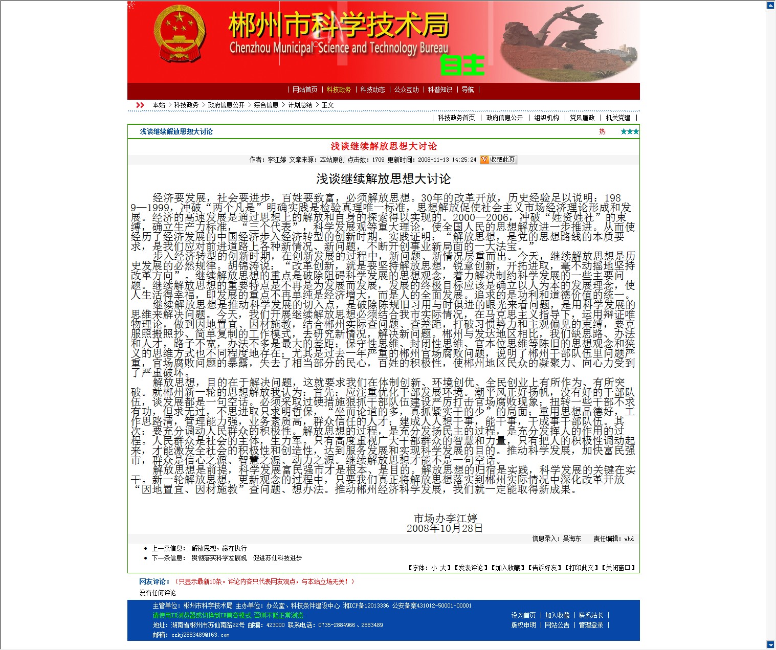 解放思想,目的在于解决问题,这就要求我们在体制创新、环境创优、全民创业上有所作为、有所突破。就郴州新一轮的思想解放我认为:首先:应注重优化干部发展环境。潮平风正好扬帆,没有好的干部队伍,谈发展都是一句空话。必须采取过硬措施狠抓干部队伍建设严厉打击官场腐败现象;扭转一些干部不求有功,但求无过,不思进取只求明哲保,“坐而论道的多,真抓紧实干的少”的局面;重用思想品德好,工作思路清,管理能力强,业务素质高,群众信任的人才;建成人人想干事,能干事,干成事干部队伍。其次:要充分调动人民群众的积极性。解放思想的过程,是充分发扬民主的过程,是充分发挥人的作用的过程。人民群众是社会的主体,生力军。只有高度重视广大干部群众的智慧和力量,只有把人的积极性调动起来,才能激发全社会的积极性和创造性,达到服务发展和实现科学发展的目的。推动科学发展,加快富民强市,群众是信心之源、智慧之源、动力之源。继续解放思想才能不是一句空话。