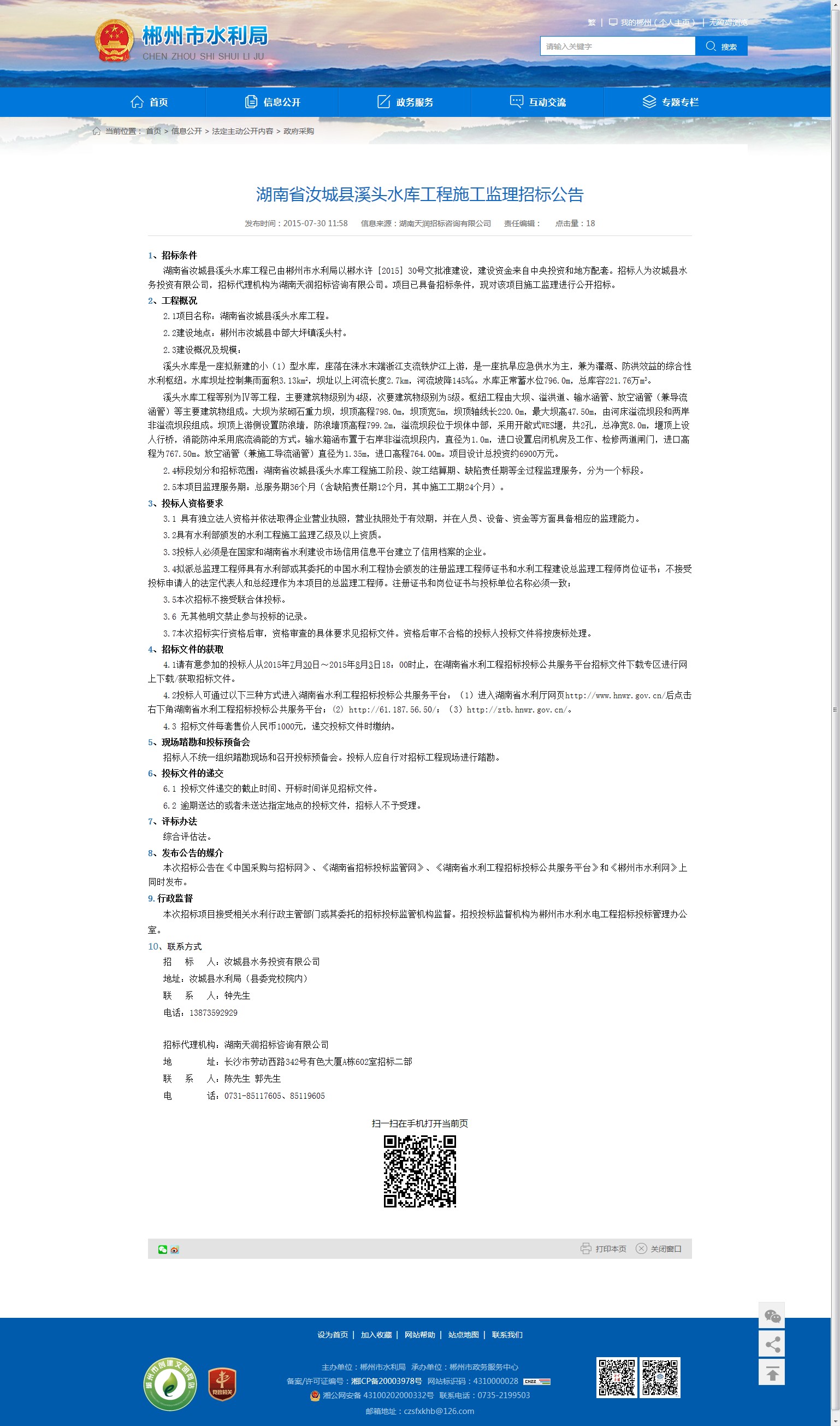 本次招标公告在《中国采购与招标网》、《湖南省招标投标监管网》、《湖南省水利工程招标投标公共服务平台》和《郴州市水利网》上同时发布。
