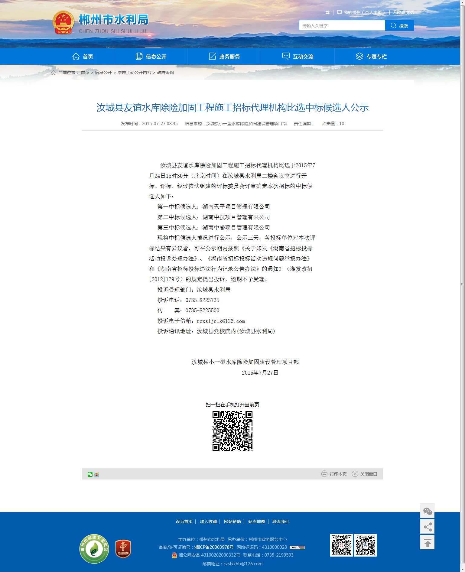 汝城县友谊水库除险加固工程施工招标代理机构比选于2015年7月24日15时30分(北京时间)在汝城县水利局二楼会议室进行开标、评标,经过依法组建的评标委员会评审确定本次招标的中标候选人如下: 第一中标候选人:湖南天平项目管理有限公司 第二中标候选人:湖南中技项目管理有限公司 第三中标候选人:湖南中誉项目管理有限公司 现将中标候选人情况进行公示,公示三天,各投标单位对本次评标结果有异议者,可在公示期内按照《关于印发《湖南省招标投标活动投诉处理办法》、《湖南省招标投标活动违规问题举报办法》和《湖南省招标投标违法行为记录公告办法》的通知》(湘发改招[2012]179号)的规定提出投诉,逾期不予受理。 投诉受理部门:汝城县水利局 投诉电话:0735-8223735 传 真:0735-8225500 投诉电子信箱:rcxsljslk@126.com 投诉通讯地址:汝城县党校院内(汝城县水利局)