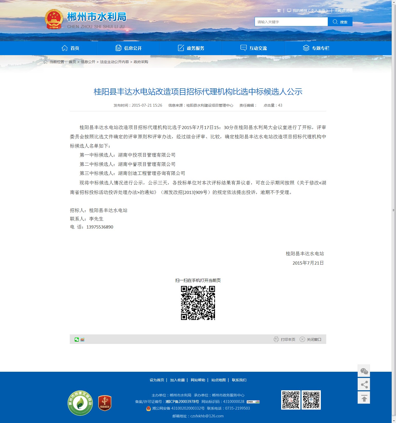 桂阳县丰达水电站改造项目招标代理机构比选于2015年7月17日15:30分在桂阳县水利局大会议室进行了开标,评审委员会按照比选文件确定的评审原则和评审办法,经过综合评审、比较,确定桂阳县丰达水电站改造项目招标代理机构中标候选人名单如下: