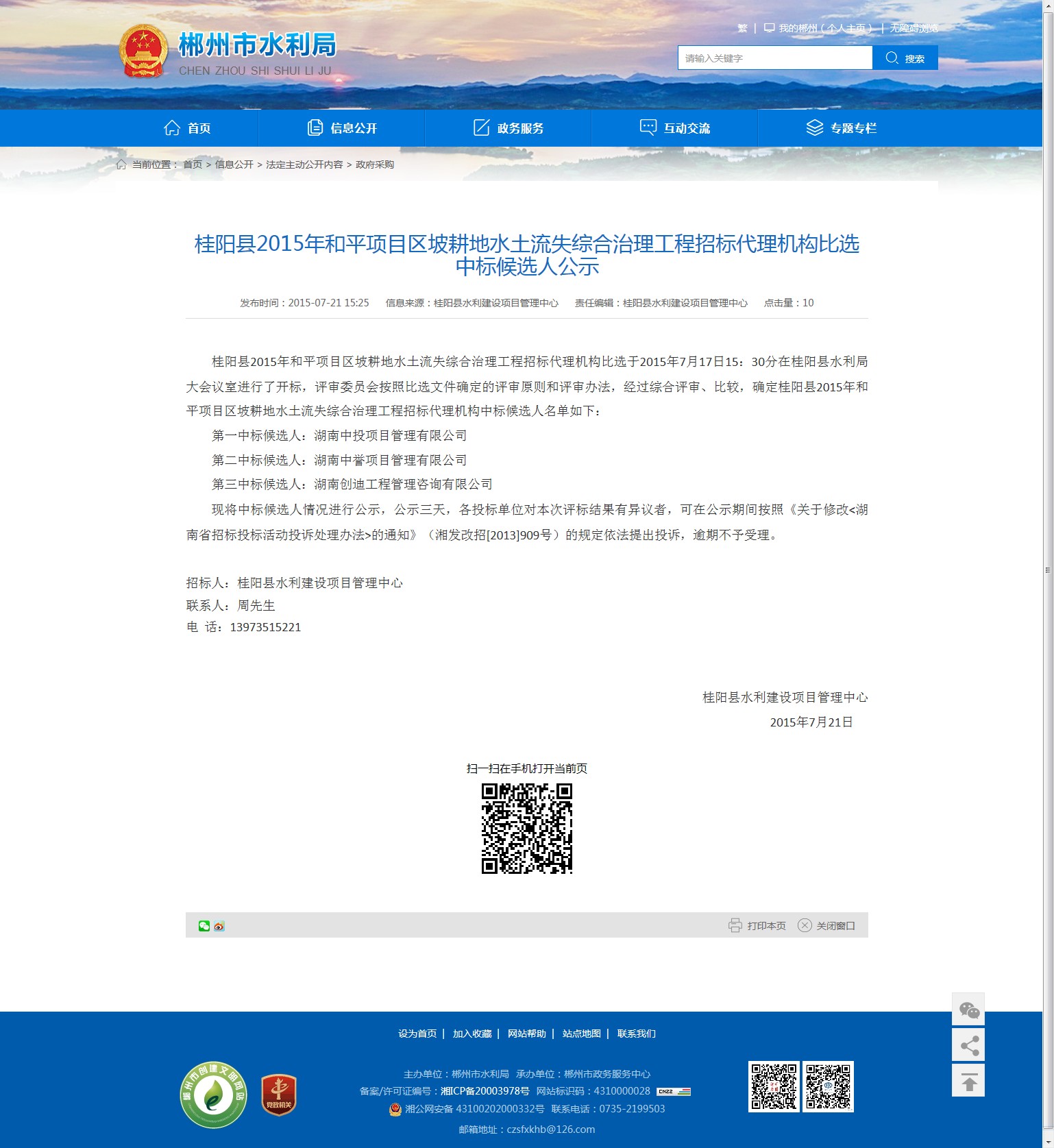 桂阳县2015年和平项目区坡耕地水土流失综合治理工程招标代理机构比选于2015年7月17日15:30分在桂阳县水利局大会议室进行了开标,评审委员会按照比选文件确定的评审原则和评审办法,经过综合评审、比较,确定桂阳县2015年和平项目区坡耕地水土流失综合治理工程招标代理机构中标候选人名单如下: