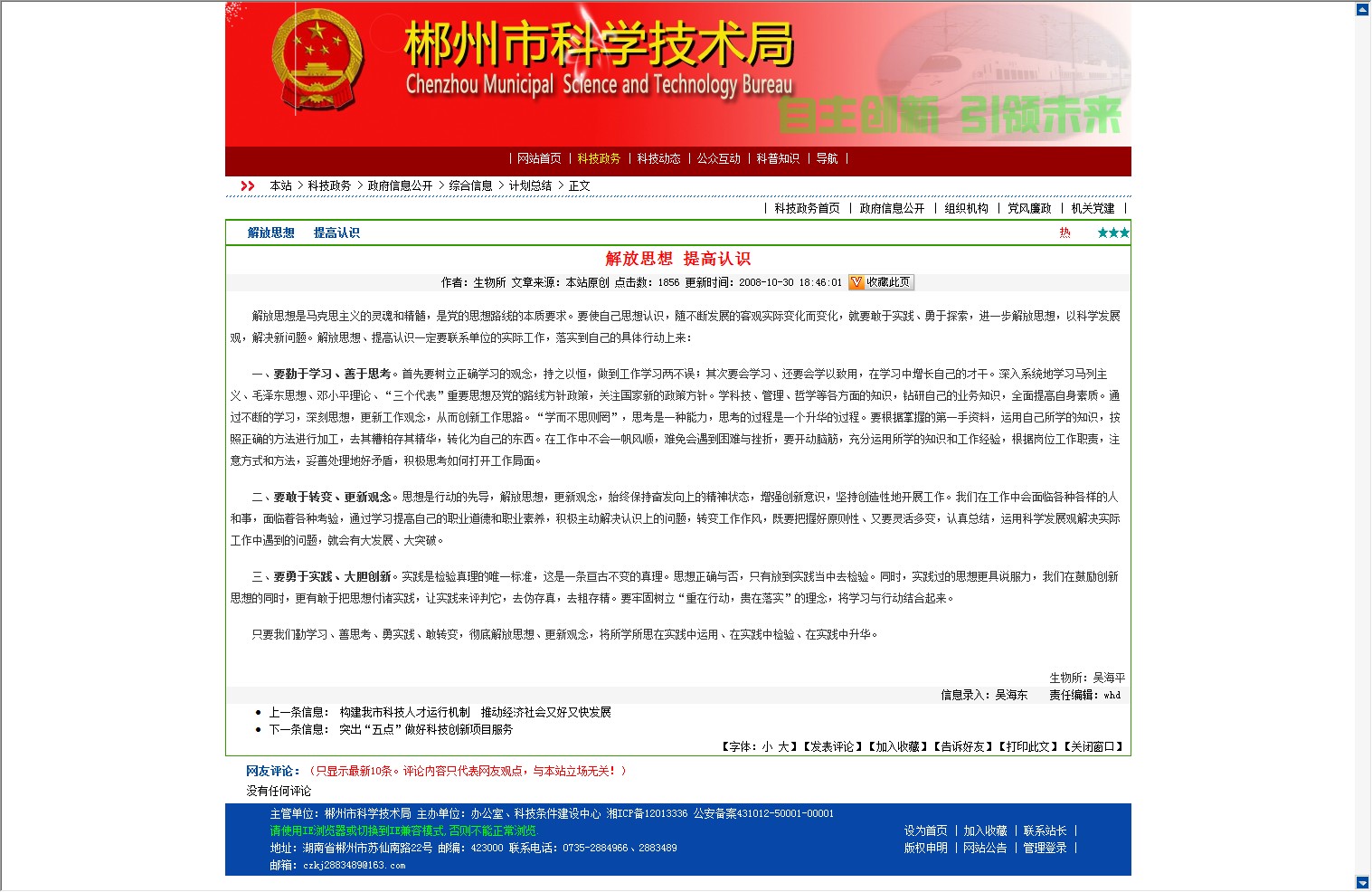 解放思想是马克思主义的灵魂和精髓,是党的思想路线的本质要求。要使自己思想认识,随不断发展的客观实际变化而变化,就要敢于实践、勇于探索,进一步解放思想,以科学发展观,解决新问题。解放思想、提高认识一定要联系单位的实际工作,落实到自己的具体行动上来: