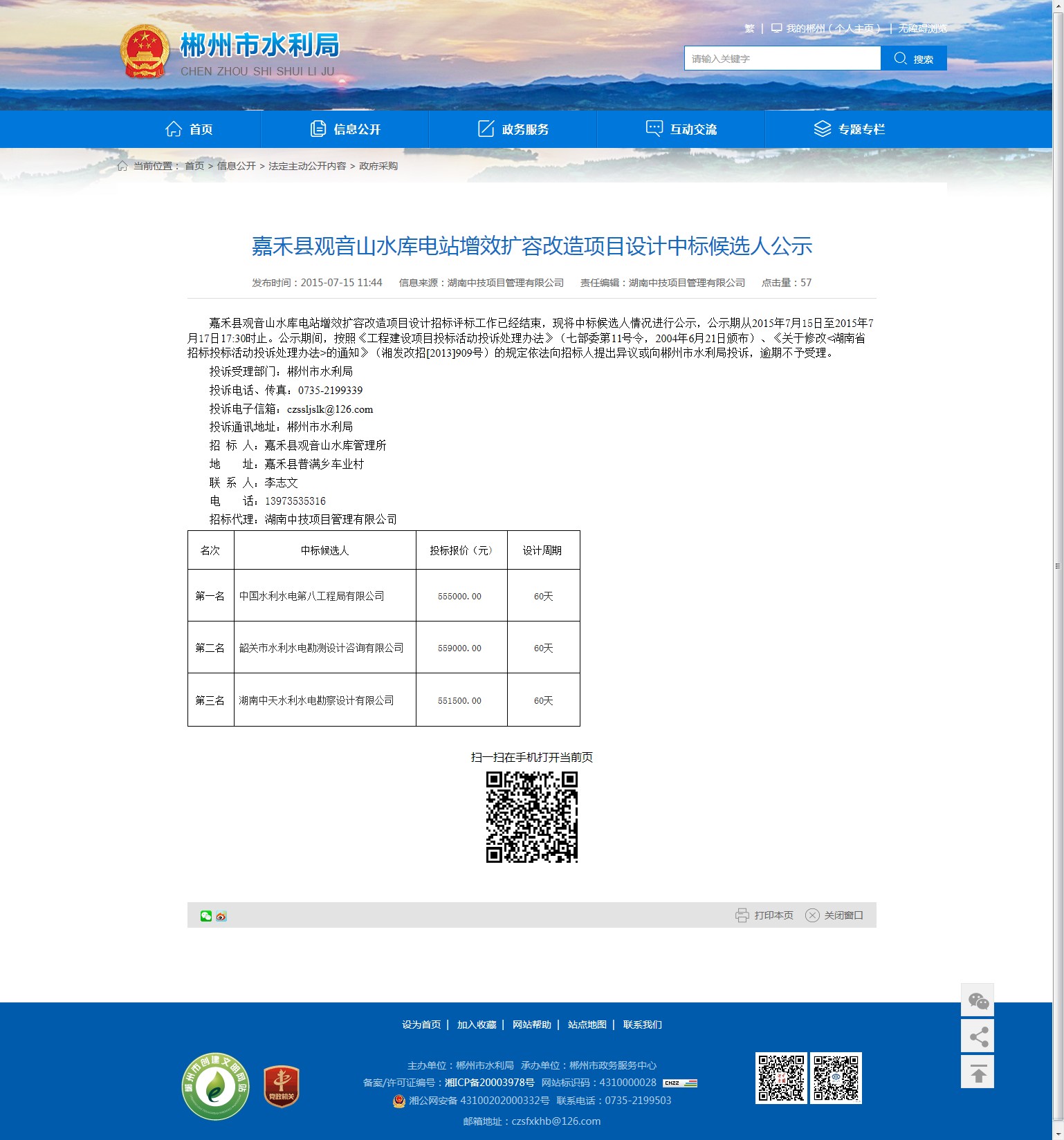 嘉禾县观音山水库电站增效扩容改造项目设计招标评标工作已经结束,现将中标候选人情况进行公示,公示期从2015年7月15日至2015年7月17日17:30时止。公示期间,按照《工程建设项目投标活动投诉处理办法》(七部委第11号令,2004年6月21日颁布)、《关于修改<湖南省招标投标活动投诉处理办法>的通知》(湘发改招[2013]909号)的规定依法向招标人提出异议或向郴州市水利局投诉,逾期不予受理。