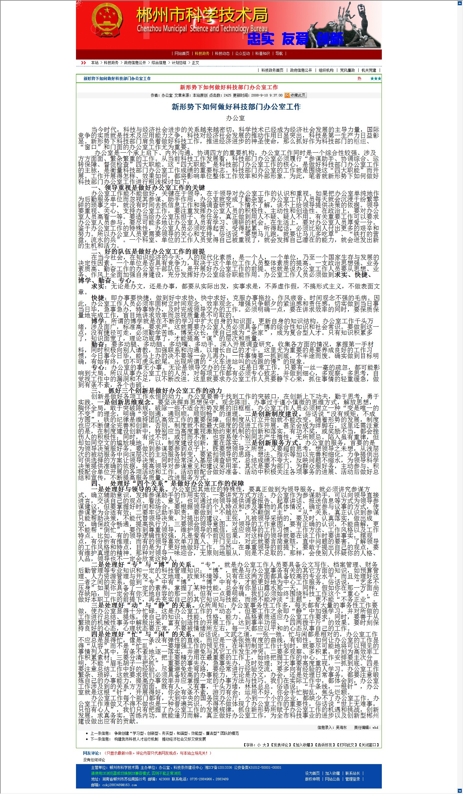 办公室是一个承上启下、内外沟通、协调四方的重要机构,办公室工作同时是一个综合性较强、涉及方方面面、繁杂繁重的工作。从当前科技工作发展看,科技部门办公室必须履行“参谋助手、协调综合、运转保障、督促检查”四大职能。这“四大职能”是科技部门办公室工作的核心,是做好科技部门办公室工作的主脉,是衡量科技部门办公室工作成绩的重要标志。科技部门办公室的工作就是围绕这“四大职能”而开展。工作开展得怎样、效果如何,都将影响单位整体工作效率和外部形象。为此,笔者就新形势下如何做好科技部门办公室工作进行粗浅探讨如下: