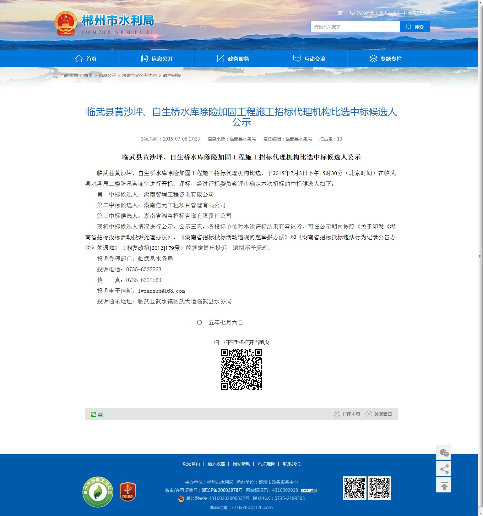 投诉通讯地址:临武县武水镇临武大道临武县水务局