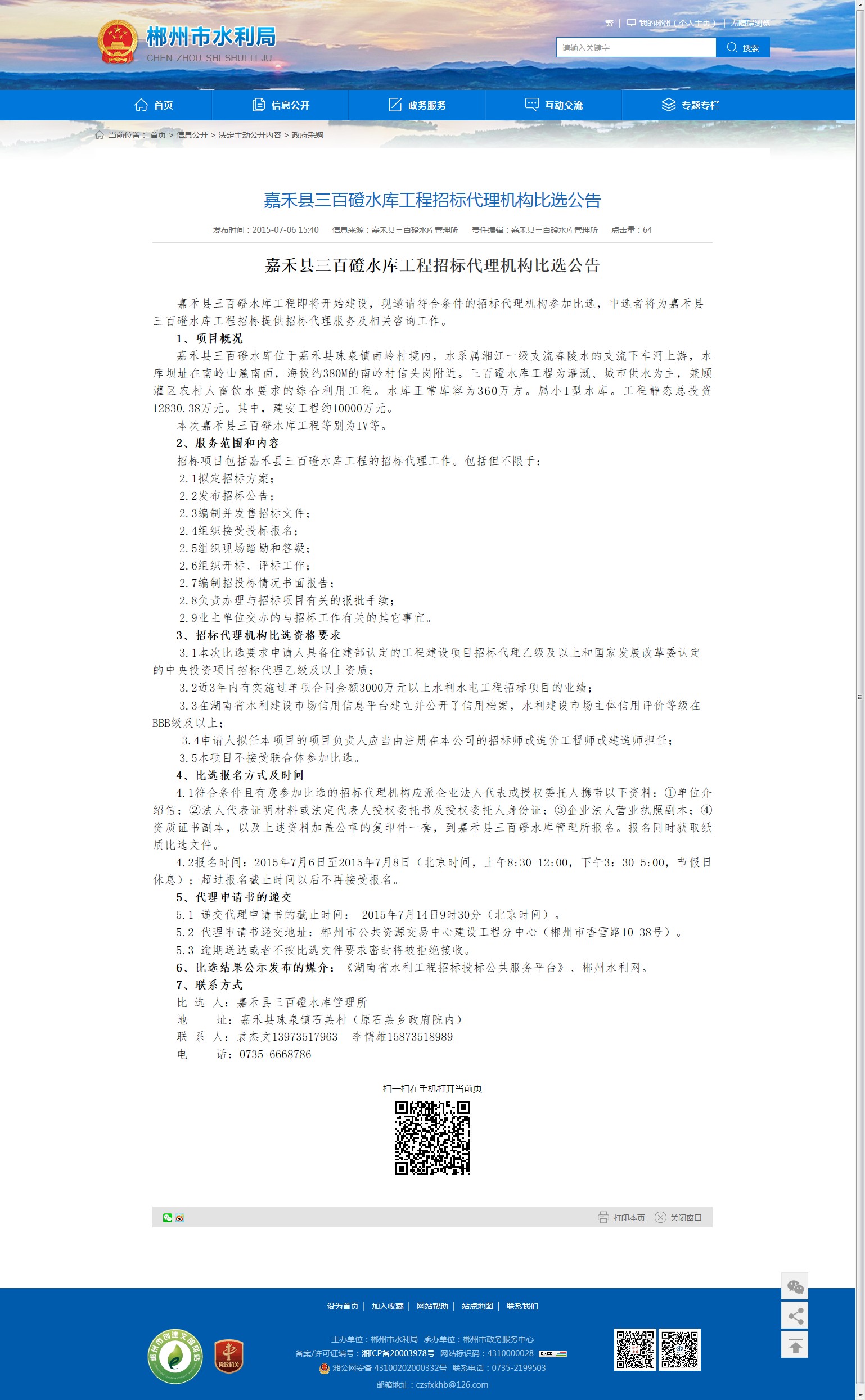 6、比选结果公示发布的媒介:《湖南省水利工程招标投标公共服务平台》、郴州水利网。