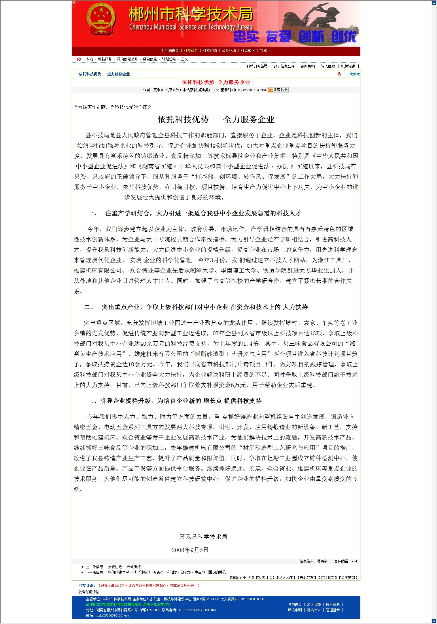 县科技局是县人民政府管理全县科技工作的职能部门,直接服务于企业,企业是科技创新的主体,我们始终坚持加强对企业的科技引导,促进企业加快科技创新步伐,加大对重点企业重点项目的扶持和服务力度,发展具有嘉禾特色的铸锻造业、食品精深加工等技术标导性企业和产业集群。特别是《中华人民共和国中小型企业促进法》和《湖南省实施 ? 中华人民共和国中小型企业促进法 ? 办法 》实施以来,县科技局在县委、县政府的正确领导下,服从和服务于“打基础、创环境、转作风、促发展”的工作大局,大力扶持和服务于中小企业,依托科技优势,在引智引技、项目扶持、培育生产力促进中心上下功夫,为中小企业的进一步发展壮大提供和创造了良好的环境。