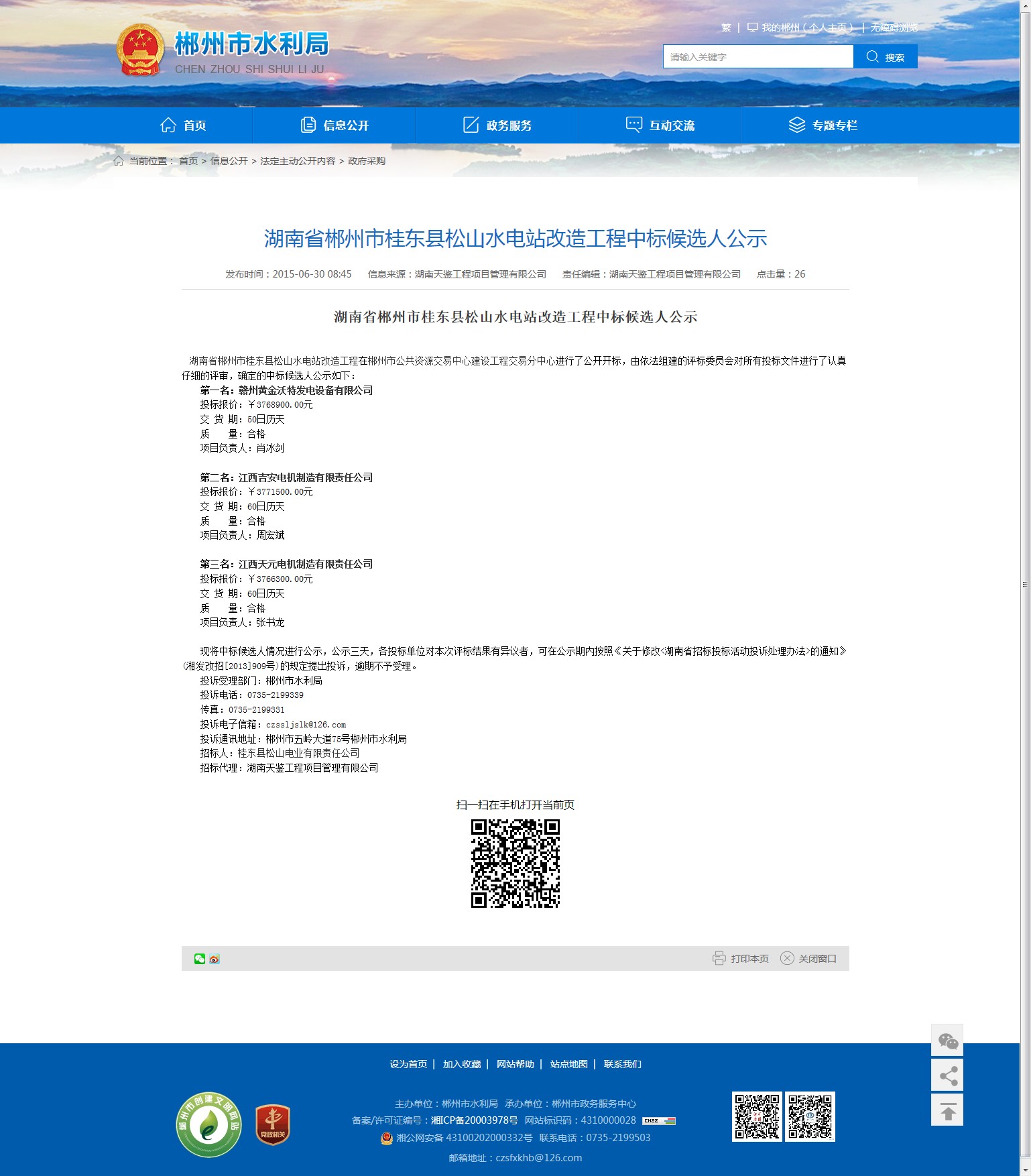 湖南省郴州市桂东县松山水电站改造工程中标候选人公示