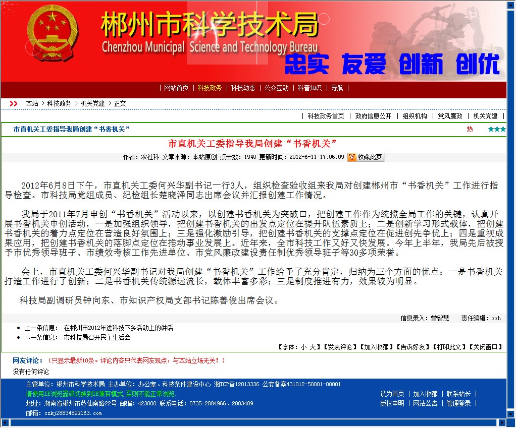我局于2011年7月申创“书香机关”活动以来,以创建书香机关为突破口,把创建工作作为统揽全局工作的关键,认真开展书香机关申创活动,一是加强组织领导,把创建书香机关的出发点定位在提升队伍素质上;二是创新学习形式载体,把创建书香机关的着力点定位在营造良好氛围上;三是强化激励引导,把创建书香机关的支撑点定位在促进创先争优上;四是重视成果应用,把创建书香机关的落脚点定位在推动事业发展上。近年来,全市科技工作又好又快发展。今年上半年,我局先后被授予市优秀领导班子、市绩效考核工作先进单位、市党风廉政建设责任制优秀领导班子等30多项荣誉。