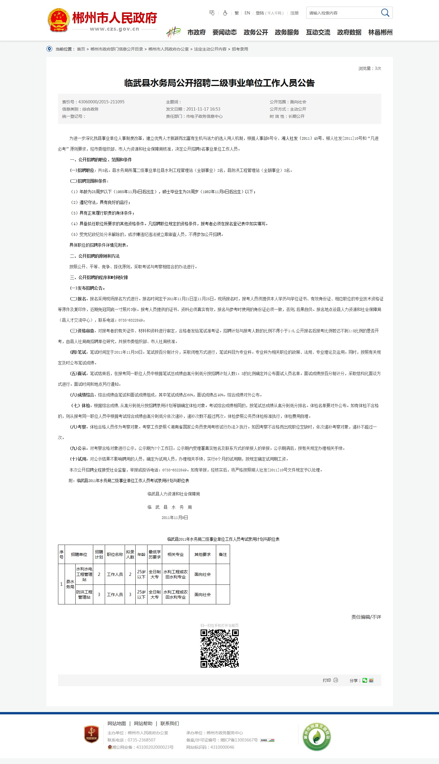 临武县2011年水务局二级事业单位工作人员考试录用计划与职位表