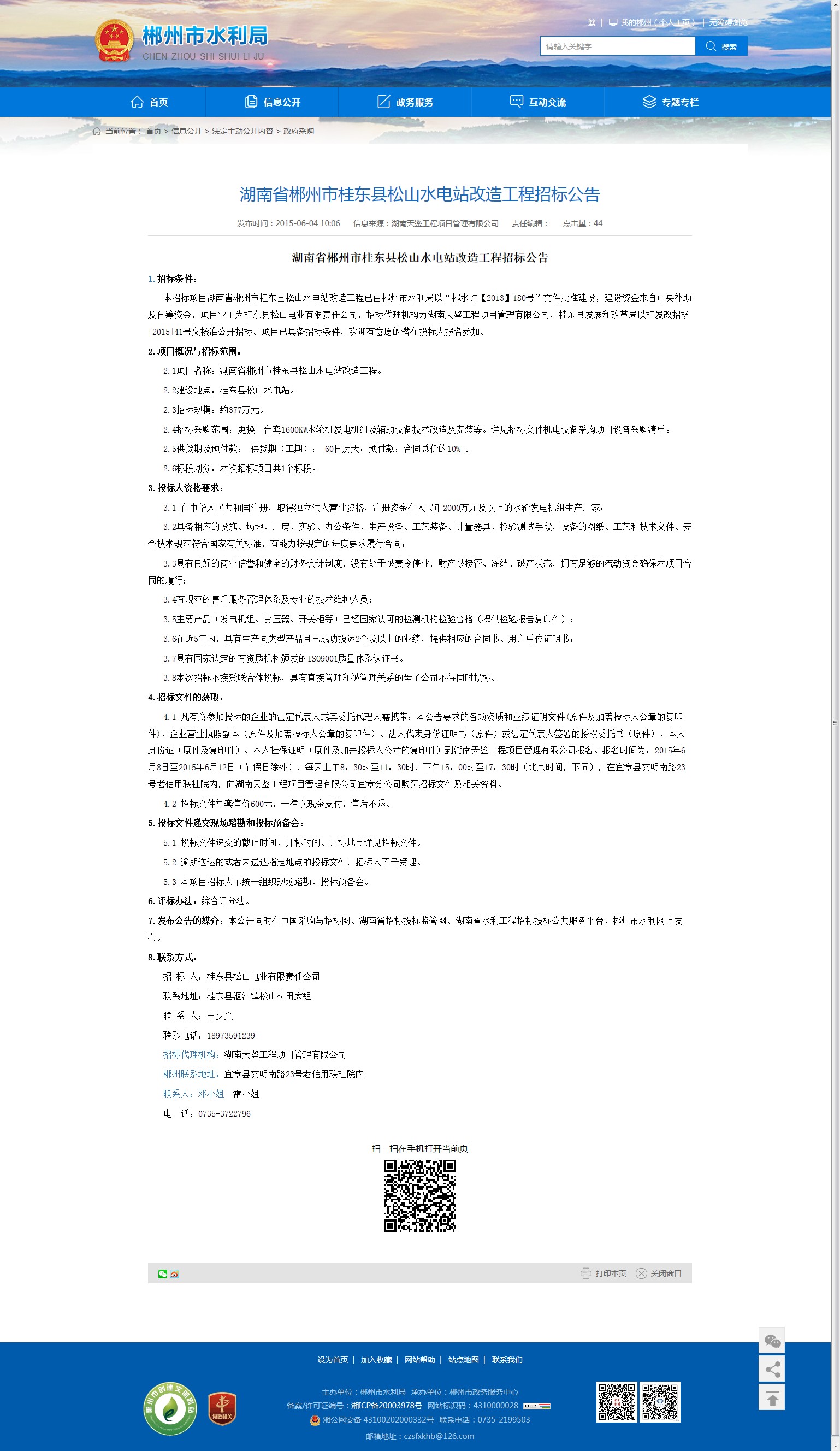7.发布公告的媒介:本公告同时在中国采购与招标网、湖南省招标投标监管网、湖南省水利工程招标投标公共服务平台、郴州市水利网上发布。