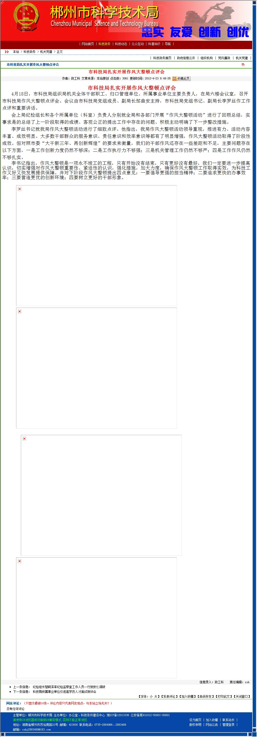 4月18日,市科技局组织局机关全体干部职工、归口管理单位、所属事业单位主要负责人,在局六楼会议室,召开市科技局作风大整顿点评会。会议由市科技局党组成员、副局长邹曲安主持,市科技局党组书记、副局长李罗丝作工作点评和重要讲话。