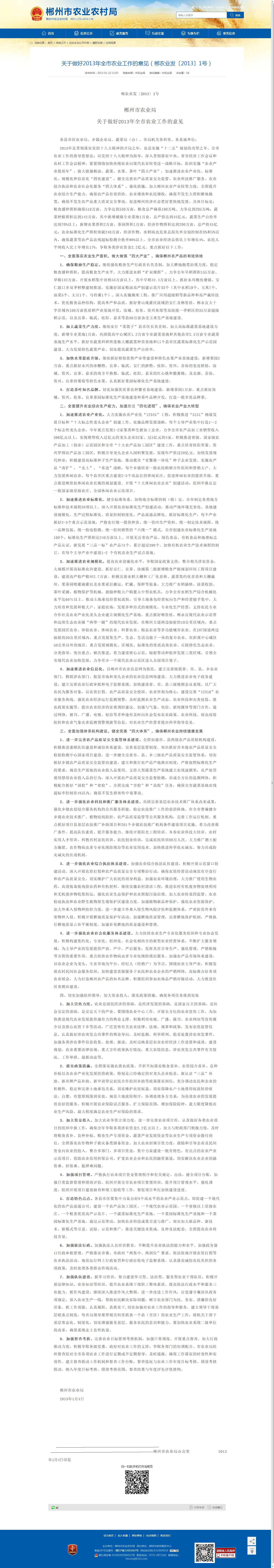 2013年是贯彻落实党的十八大精神的开局之年,也是实施“十二五”规划的攻坚之年。全市农业工作的指导思想是:以党的十八大精神为指导,深入贯彻落实中央、省市经济工作会议和农村工作会议精神,紧紧围绕加快传统农业向现代农业转变这一战略目标,组织实施“农业产业提质年”,做大做强粮油、蔬菜、水果、茶叶“四大产业”,加速推进农业产业化、标准化、规模化和信息化“四化建设”,健全完善农产品质量安全监管、农业科技推广服务、农业综合执法和农业社会化服务“四大体系”,强化措施,加大郴州农业产业转型力度,全面提升农业综合生产能力,确保农产品有效供给、农业增效和农民增收,确保不发生大面积耕地抛荒,确保不发生农产品重大质量安全事故,促进郴州经济社会更好更快地发展。具体目标是:粮食播种面积确保510万亩、力争达到530万亩,粮食总产确保190万吨、力争达到205万吨;蔬菜种植面积达到142万亩,其中新增城镇专业菜地1万亩,总产值达到45亿元,蔬菜生产自给率达到70%以上;新增水果面积2万亩、茶园面积1万亩,经济作物面积达到200万亩,总产值45亿元;农业标准化生产面积突破240万亩,经济作物、水稻病虫危害总损失率分别控制在8%和5%以内,确保蔬菜等农产品农残超标检测合格率96%以上。全市农业经济总值比上年增长4%,农民人平纯收入比上年增长17%,争取各类涉农资金2.2亿元。重点抓好以下工作: