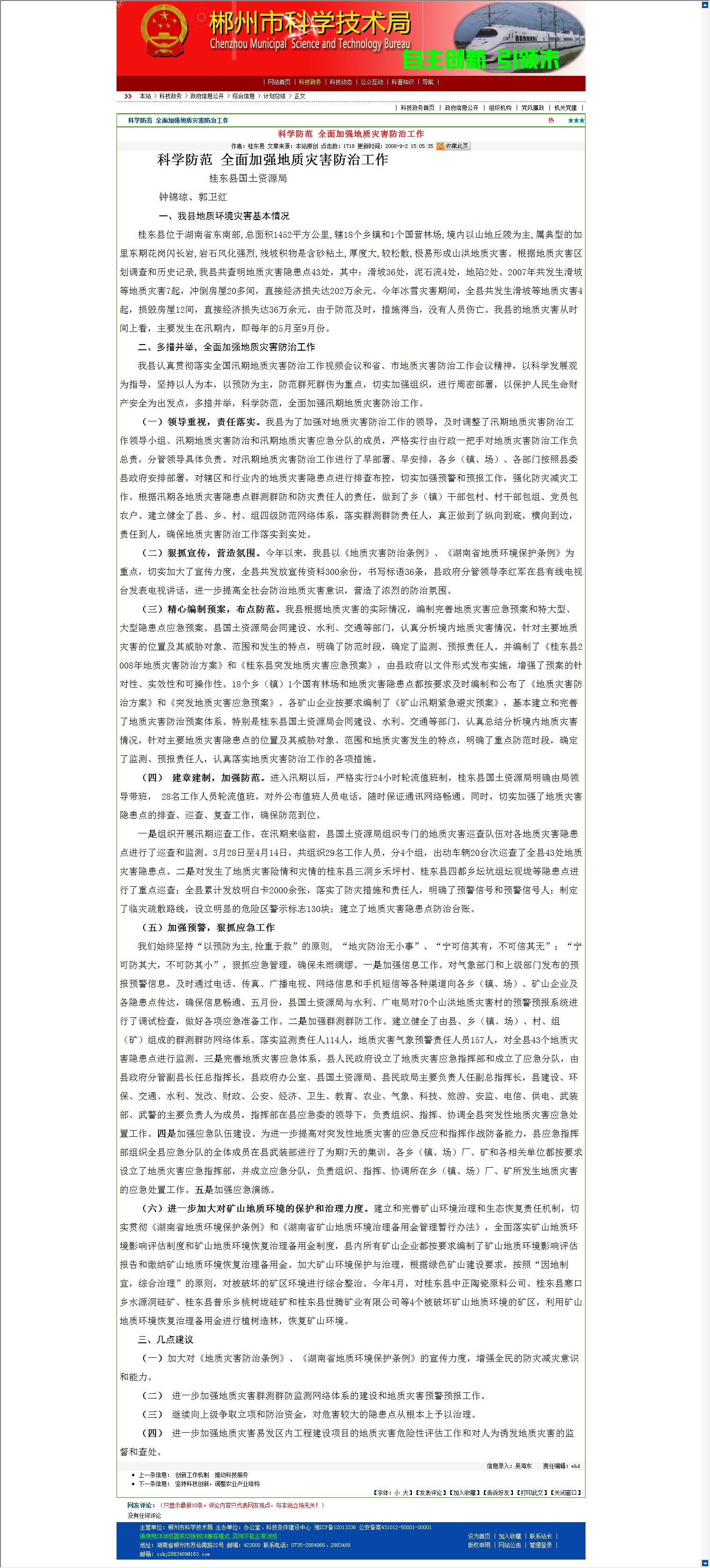 (三)精心编制预案,布点防范。我县根据地质灾害的实际情况,编制完善地质灾害应急预案和特大型、大型隐患点应急预案。县国土资源局会同建设、水利、交通等部门,认真分析境内地质灾害情况,针对主要地质灾害的位置及其威胁对象、范围和发生的特点,明确了防范时段,确定了监测、预报责任人。并编制了《桂东县2008年地质灾害防治方案》和《桂东县突发地质灾害应急预案》,由县政府以文件形式发布实施,增强了预案的针对性、实效性和可操作性。18个乡(镇)1个国有林场和地质灾害隐患点都按要求及时编制和公布了《地质灾害防治方案》和《突发地质灾害应急预案》。各矿山企业按要求编制了《矿山汛期紧急避灾预案》,基本建立和完善了地质灾害防治预案体系。特别是桂东县国土资源局会同建设、水利、交通等部门,认真总结分析境内地质灾害情况,针对主要地质灾害隐患点的位置及其威胁对象、范围和地质灾害发生的特点,明确了重点防范时段,确定了监测、预报责任人,认真落实地质灾害防治工作的各项措施。