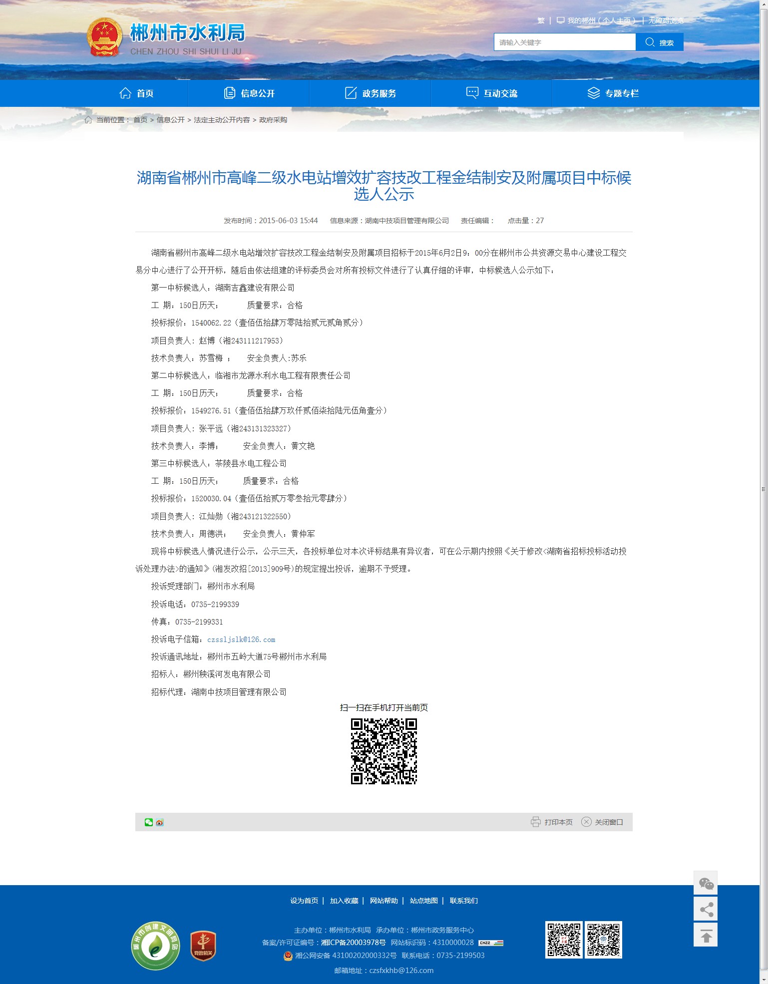 湖南省郴州市高峰二级水电站增效扩容技改工程金结制安及附属项目招标于2015年6月2日9:00分在郴州市公共资源交易中心建设工程交易分中心进行了公开开标,随后由依法组建的评标委员会对所有投标文件进行了认真仔细的评审,中标候选人公示如下: