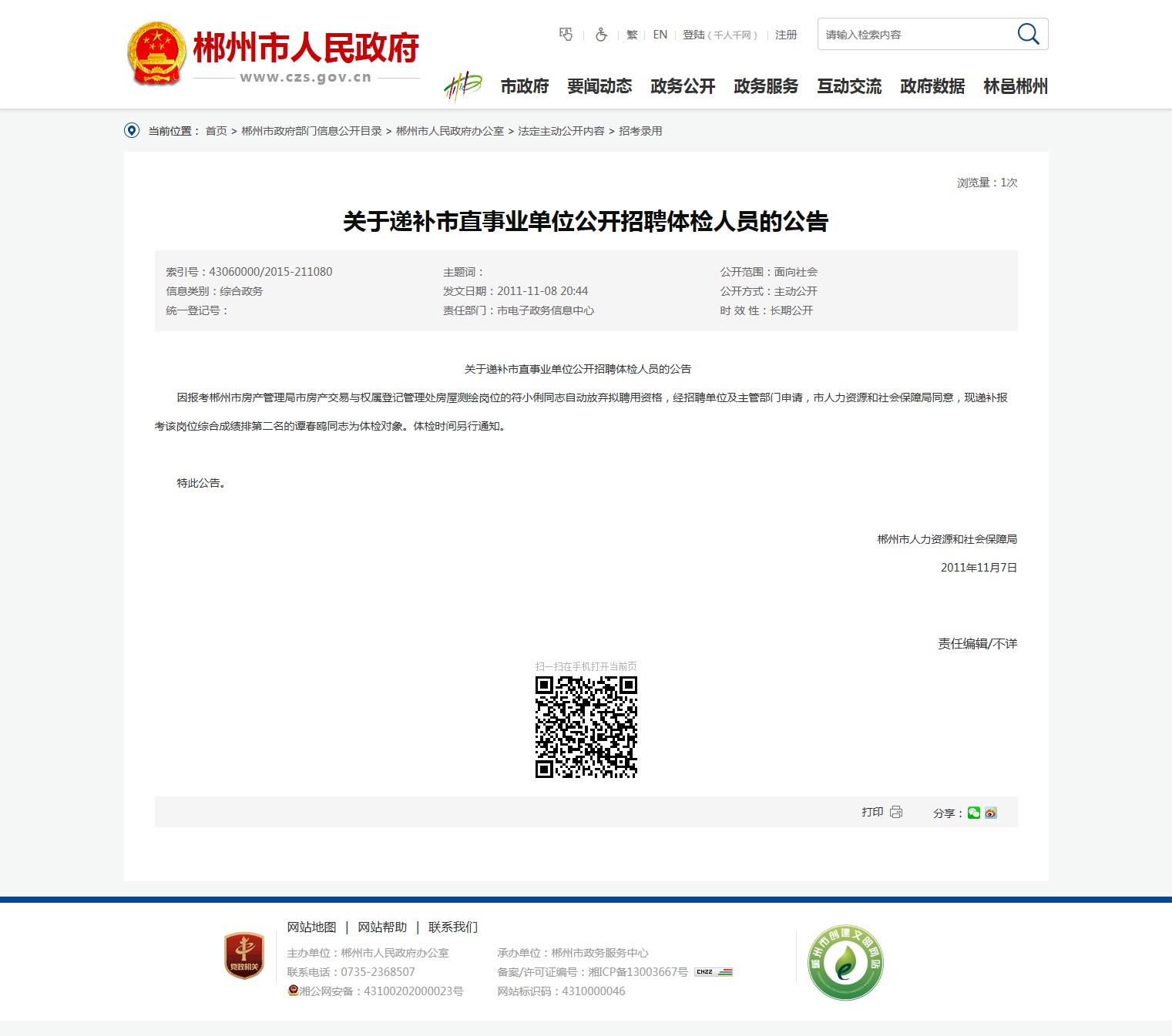 发布机构:郴州市人力资源和社会保障局