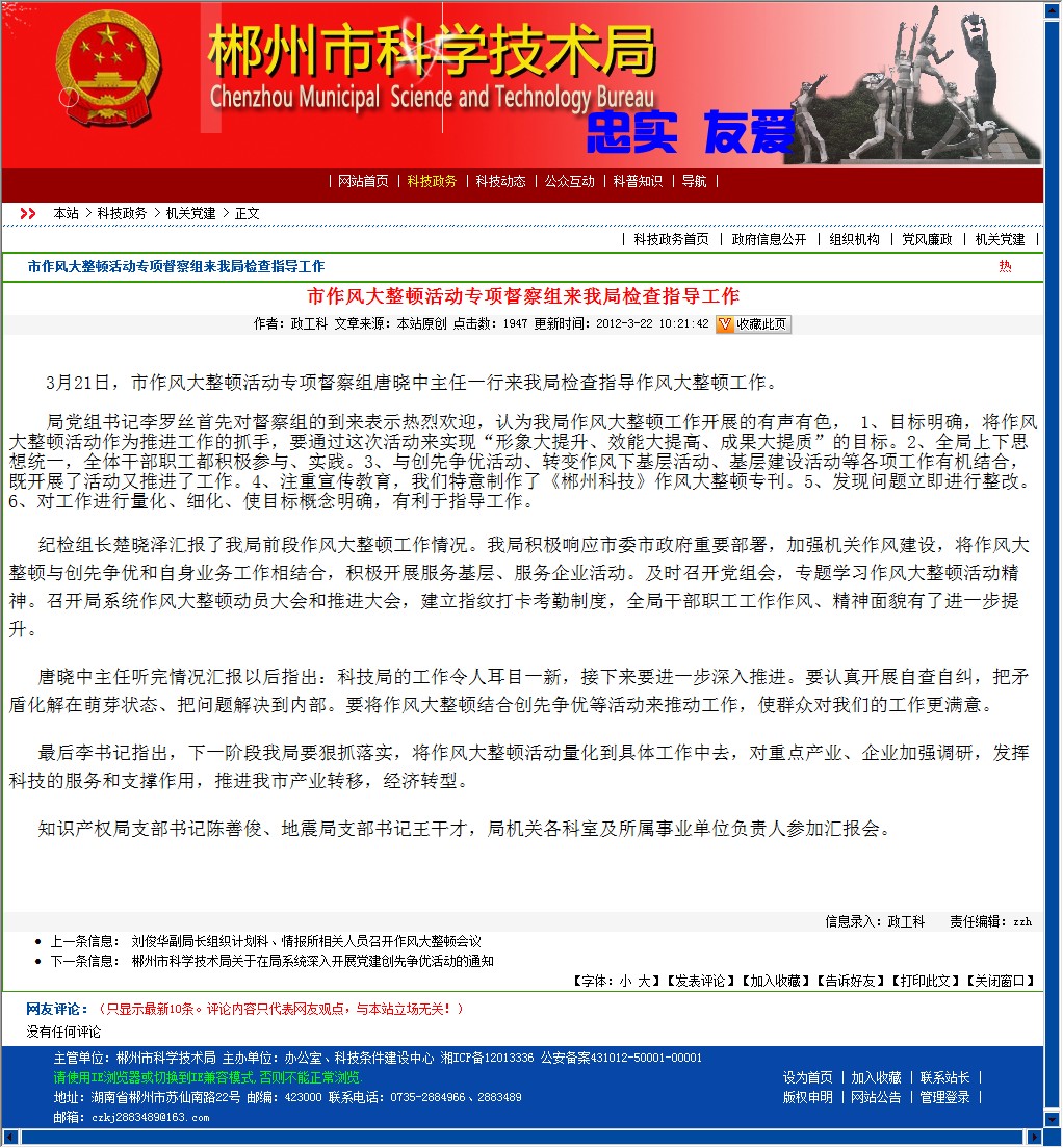 3月21日,市作风大整顿活动专项督察组唐晓中主任一行来我局检查指导作风大整顿工作。