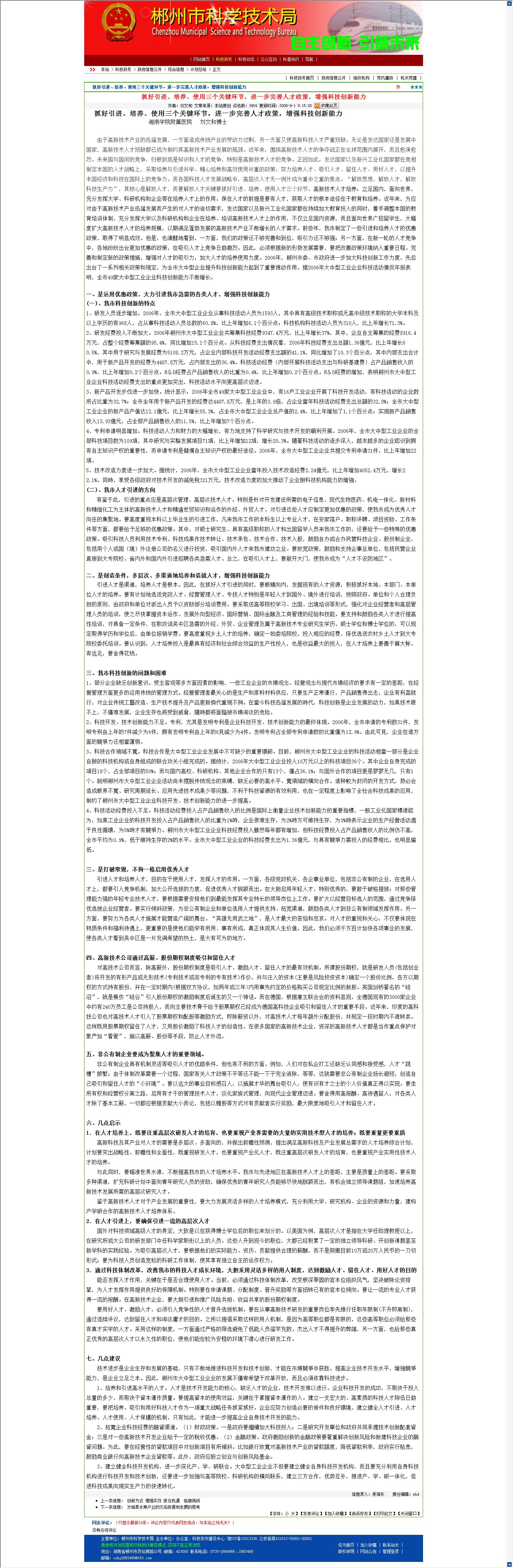 抓好引进、培养、使用三个关键环节,进一步完善人才政策,增强科技创新能力
