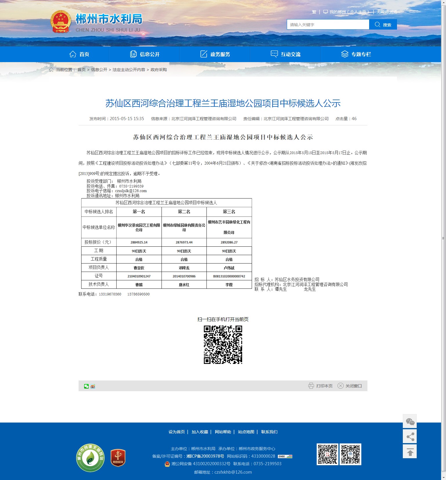 苏仙区西河综合治理工程兰王庙湿地公园项目中标候选人公示