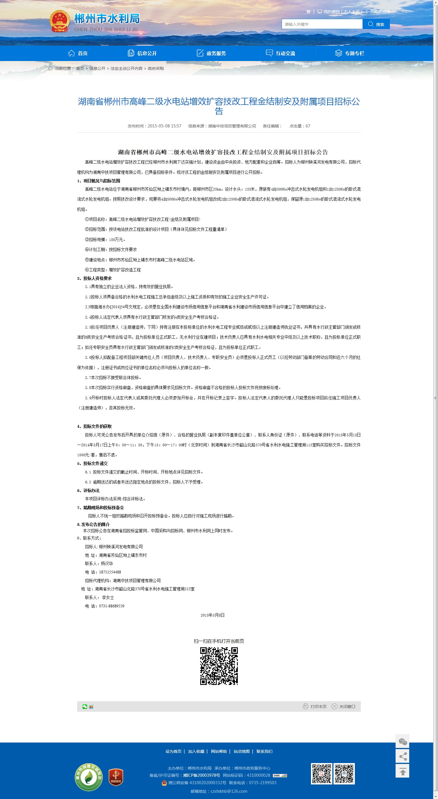 湖南省郴州市高峰二级水电站增效扩容技改工程金结制安及附属项目招标公告