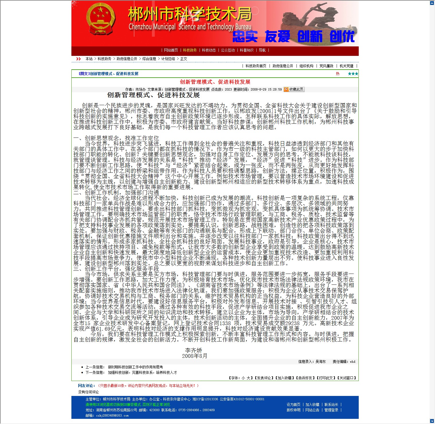 创新是一个民族进步的灵魂,是国家兴旺发达的不竭动力。为贯彻全国、全省科技大会关于建设创新型国家和创新型社会的精神,郴州市委、市政府高度重视科技创新工作,以郴政发[2008]1号文件出台了《关于鼓励和引导科技创新的实施意见》,标志着我市自主创新政策环境已逐步形成。怎样联系科技工作的具体实际,解放思想,在推进科技创新工作中,积极为市委、市政府建言献策,当好科技参谋;创新郴州科技工作机制,为郴州科技事业跨越式发展打下良好基础,是我们每一个科技管理工作者应该认真思考的问题。