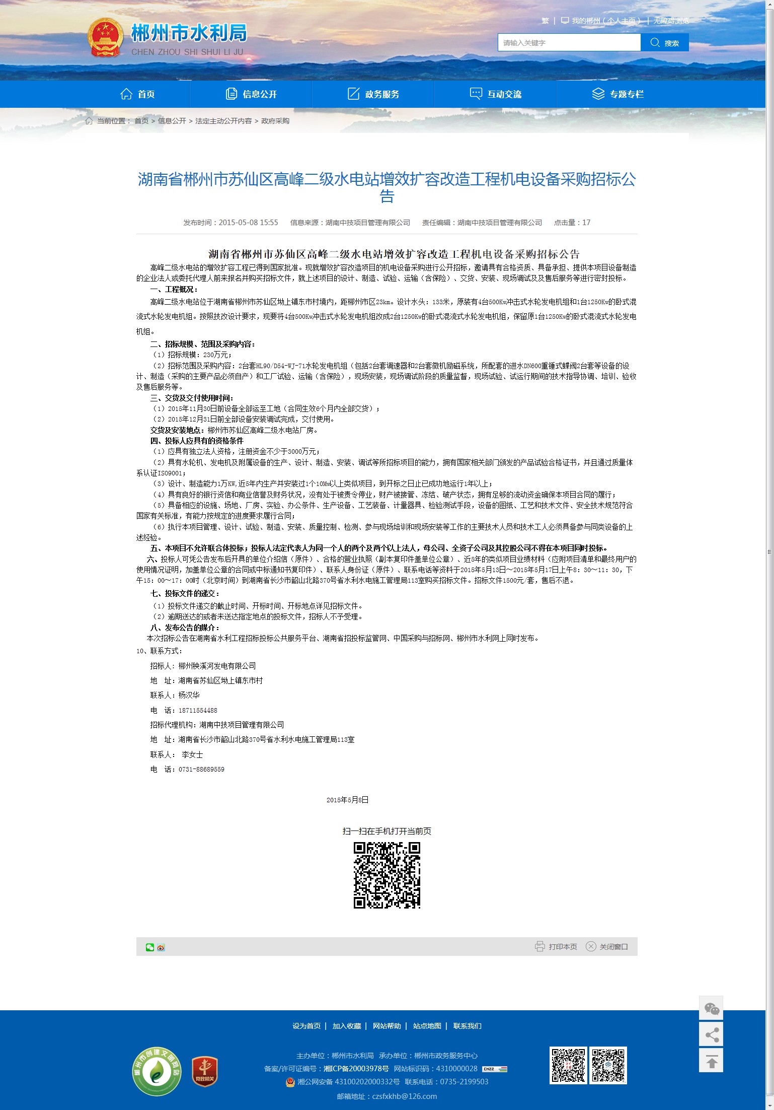湖南省郴州市苏仙区高峰二级水电站增效扩容改造工程机电设备采购招标公告