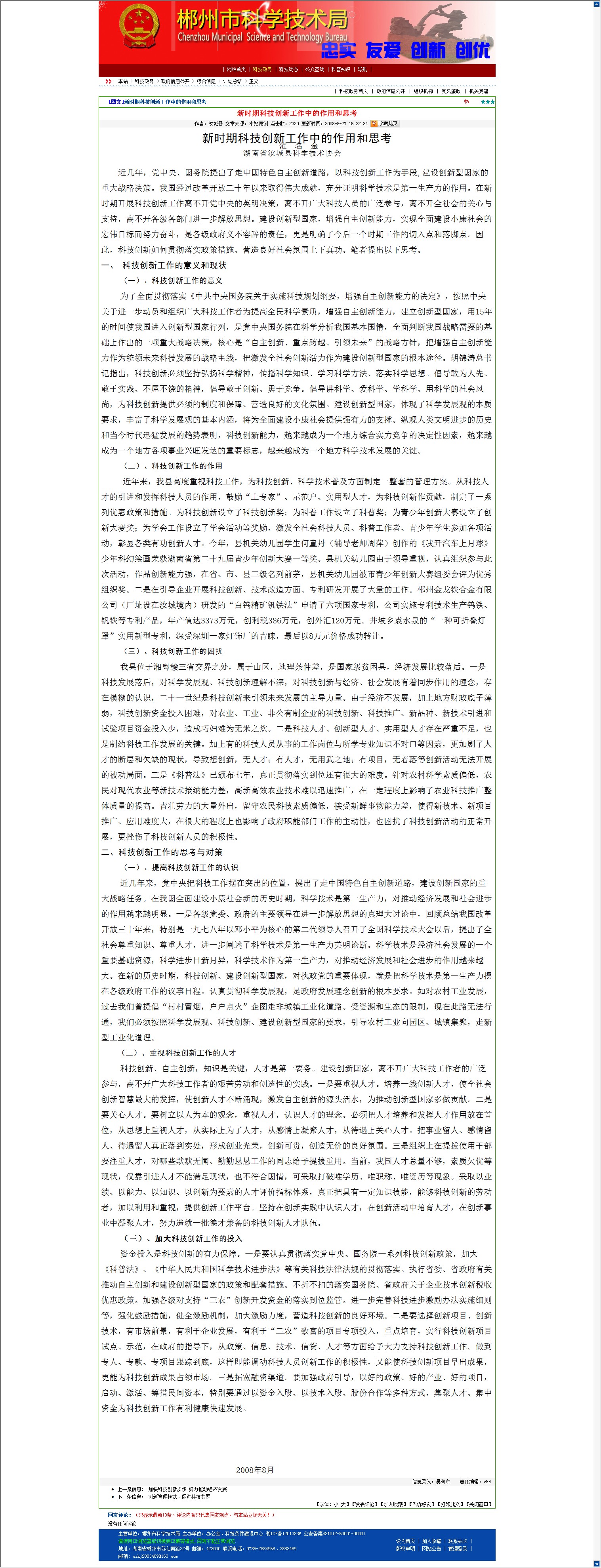 近几年来,党中央把科技工作摆在突出的位置,提出了走中国特色自主创新道路,建设创新国家的重大战略任务。在我国全面建设小康社会新的历史时期,科学技术是第一生产力,对推动经济发展和社会进步的作用越来越明显。一是各级党委、政府的主要领导在进一步解放思想的真理大讨论中,回顾总结我国改革开放三十年来,特别是一九七八年以邓小平为核心的第二代领导人召开了全国科学技术大会以后,提出了全社会尊重知识、尊重人才,进一步阐述了科学技术是第一生产力英明论断。科学技术是经济社会发展的一个重要基础资源,科学进步日新月异,科学技术作为第一生产力,对推动经济发展和社会进步的作用越来越大。在新的历史时期,科技创新、建设创新型国家,对执政党的重要体现,就是把科学技术是第一生产力摆在各级政府工作的议事日程。认真贯彻科学发展观,是政府发展理念创新的根本要求。如对农村工业发展,过去我们曾提倡“村村冒烟,户户点火”企图走非城镇工业化道路。受资源和生态的限制,现在此路无法行通,我们必须按照科学发展观、科技创新、建设创新型国家的要求,引导农村工业向园区、城镇集聚,走新型工业化道理。