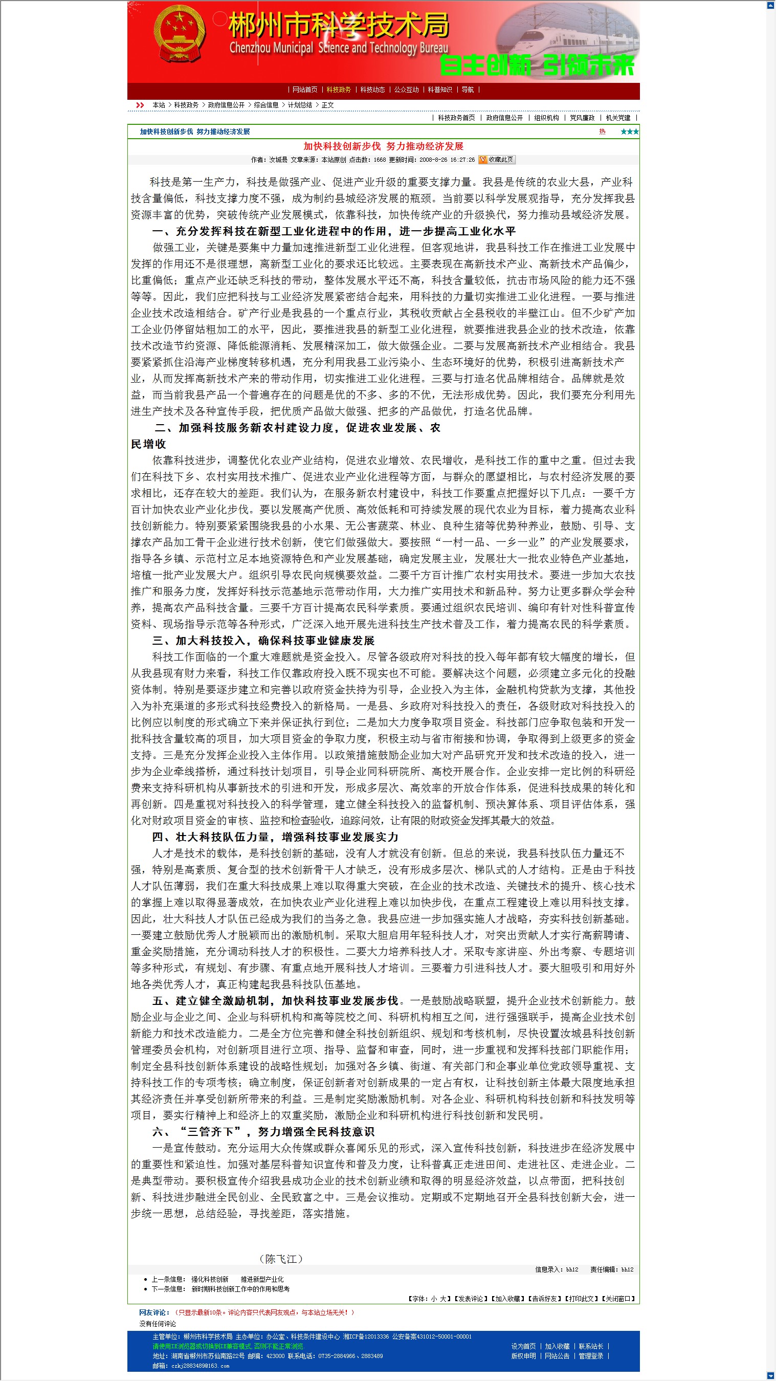 一是宣传鼓动。充分运用大众传媒或群众喜闻乐见的形式,深入宣传科技创新,科技进步在经济发展中的重要性和紧迫性。加强对基层科普知识宣传和普及力度,让科普真正走进田间、走进社区、走进企业。二是典型带动。要积极宣传介绍我县成功企业的技术创新业绩和取得的明显经济效益,以点带面,把科技创新、科技进步融进全民创业、全民致富之中。三是会议推动。定期或不定期地召开全县科技创新大会,进一步统一思想,总结经验,寻找差距,落实措施。