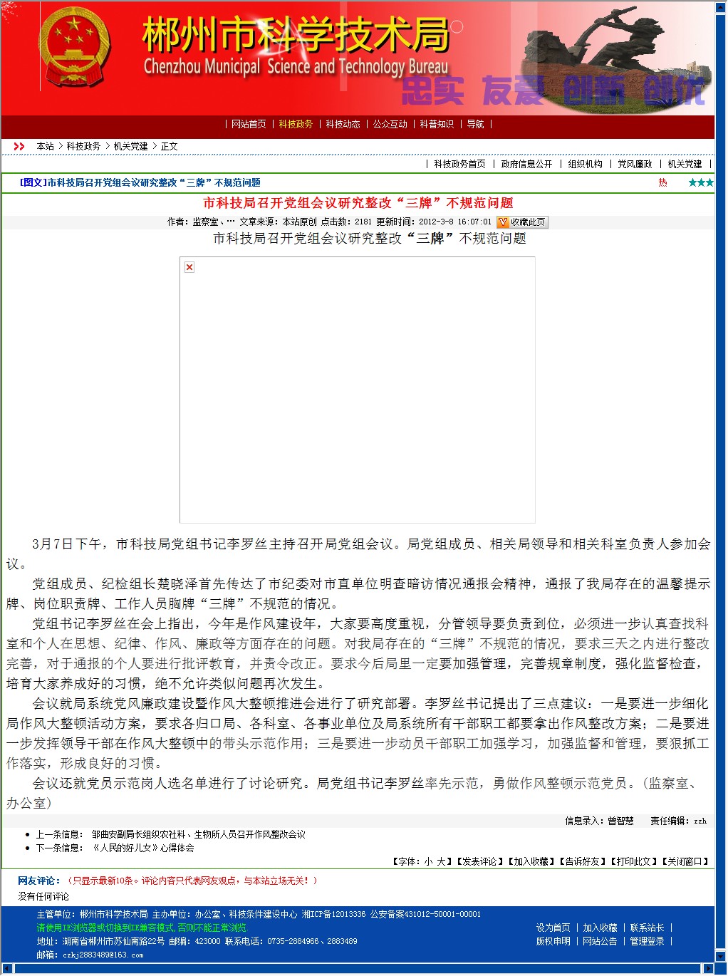 党组书记李罗丝在会上指出,今年是作风建设年,大家要高度重视,分管领导要负责到位,必须进一步认真查找科室和个人在思想、纪律、作风、廉政等方面存在的问题。对我局存在的“三牌”不规范的情况,要求三天之内进行整改完善,对于通报的个人要进行批评教育,并责令改正。要求今后局里一定要加强管理,完善规章制度,强化监督检查,培育大家养成好的习惯,绝不允许类似问题再次发生。
