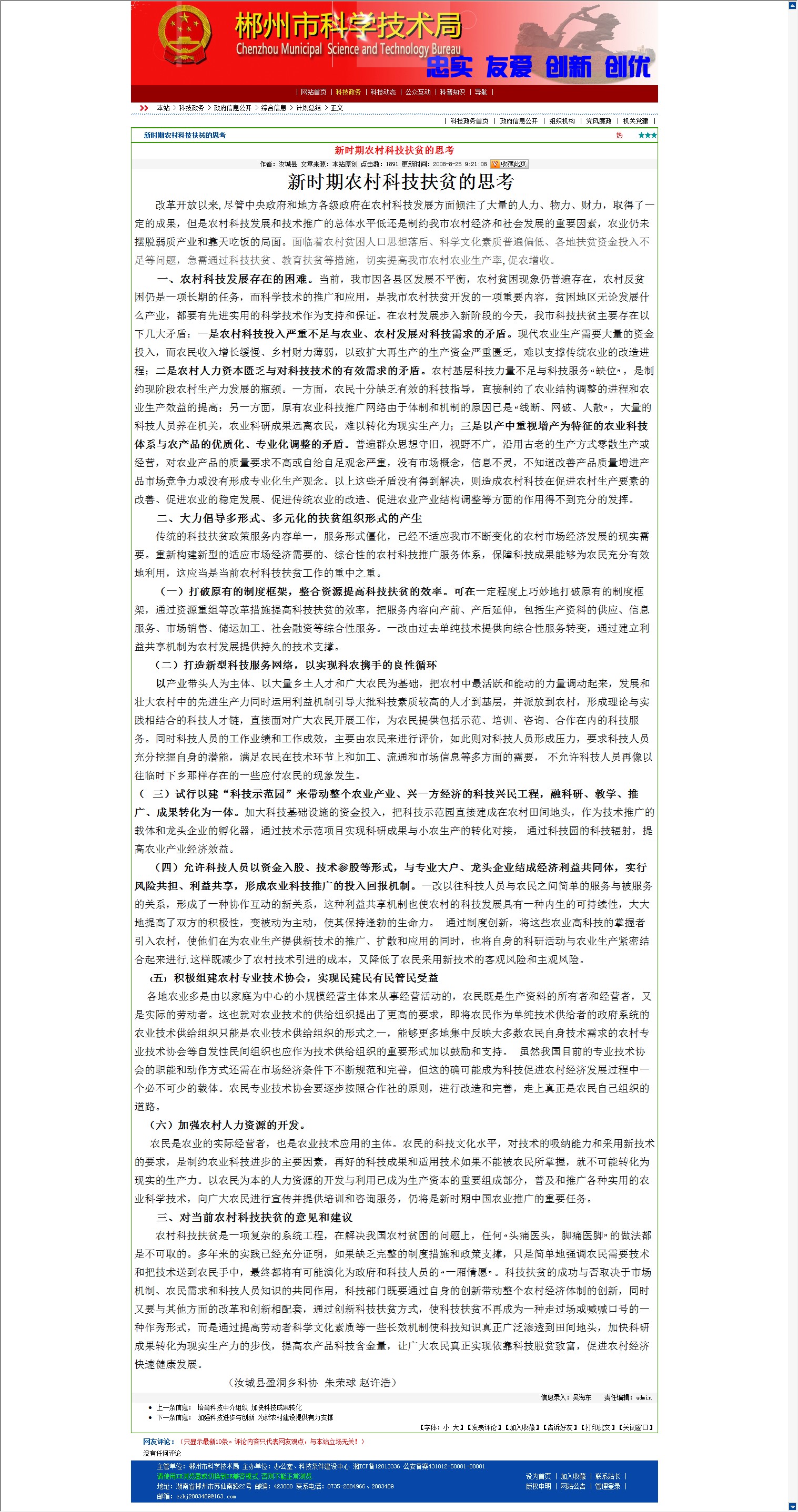 传统的科技扶贫政策服务内容单一,服务形式僵化,已经不适应我市不断变化的农村市场经济发展的现实需要。重新构建新型的适应市场经济需要的、综合性的农村科技推广服务体系,保障科技成果能够为农民充分有效地利用,这应当是当前农村科技扶贫工作的重中之重。