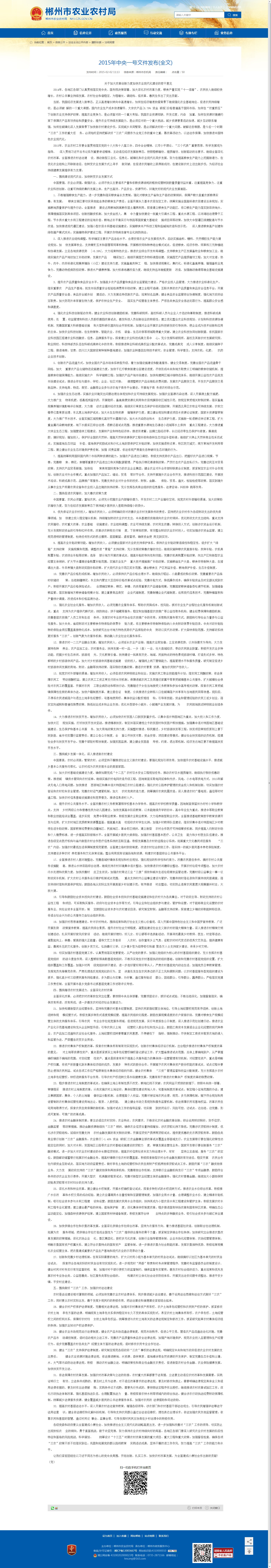 2015年,农业农村工作要全面贯彻落实党的十八大和十八届三中、四中全会精神,以邓小平理论、“三个代表”重要思想、科学发展观为指导, 深入贯彻习近平总书记系列重要讲话精神,主动适应经济发展新常态,按照稳粮增收、提质增效、创新驱动的总要求,继续全面深化农村改革,全面推进农村法治建 设,推动新型工业化、信息化、城镇化和农业现代化同步发展,努力在提高粮食生产能力上挖掘新潜力,在优化农业结构上开辟新途径,在转变农业发展方式上寻求 新突破,在促进农民增收上获得新成效,在建设新农村上迈出新步伐,为经济社会持续健康发展提供有力支撑。