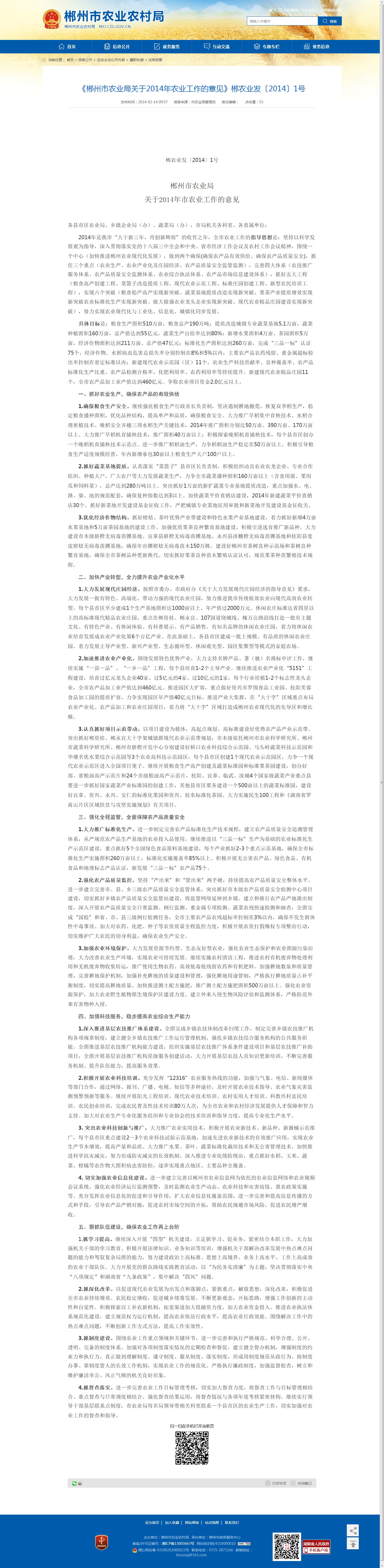 2014年是我市“大干新三年,再创新辉煌”的收官之年,全市农业工作的指导思想是:坚持以科学发展观为指导,深入贯彻落实党的十八届三中全会和中央、省市经济工作会议及农村工作会议精神,围绕一个中心(加快推进郴州农业现代化发展),做到两个确保(确保农产品有效供给、确保农产品质量安全),抓住三个重点(农业生产、农业产业化及庄园经济、农产品质量安全监管监测),完善四大体系(农技推广服务体系、农产品质量安全监测体系、农业综合执法体系、农产品市场信息建设体系),抓好五大工程(粮食高产创建工程、菜篮子改造提质工程、现代农业示范工程、标准庄园创建工程、新型农民培训工程),实现六个突破(粮食稳产高产实现新突破、蔬菜基地提质改造实现新突破、果茶产业提质增效实现新突破农业标准化生产实现新突破、做大做强农业龙头企业实现新突破、现代农业精品庄园建设实现新突破),努力实现农业现代化与工业化、信息化、城镇化同步发展。