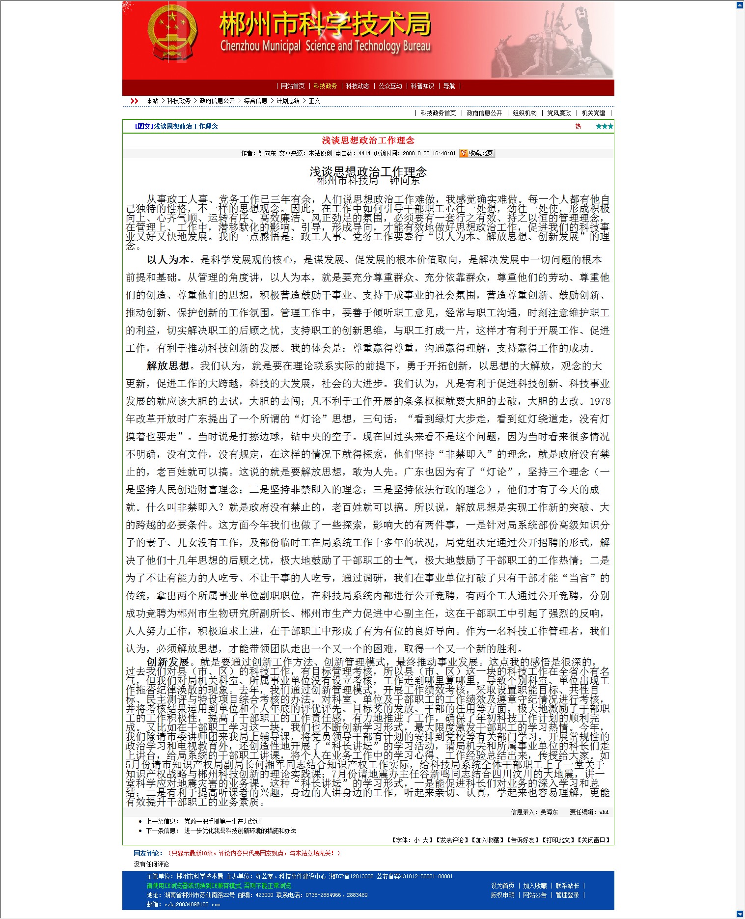 解放思想。我们认为,就是要在理论联系实际的前提下,勇于开拓创新,以思想的大解放,观念的大更新,促进工作的大跨越,科技的大发展,社会的大进步。我们认为,凡是有利于促进科技创新、科技事业发展的就应该大胆的去试,大胆的去闯;凡不利于工作开展的条条框框就要大胆的去破,大胆的去改。1978年改革开放时广东提出了一个所谓的“灯论”思想,三句话:“看到绿灯大步走,看到红灯绕道走,没有灯摸着也要走”。当时说是打擦边球,钻中央的空子。现在回过头来看不是这个问题,因为当时看来很多情况不明确,没有文件,没有规定,在这样的情况下就得探索,他们坚持“非禁即入”的理念,就是政府没有禁止的,老百姓就可以搞。这说的就是要解放思想,敢为人先。广东也因为有了“灯论”,坚持三个理念(一是坚持人民创造财富理念;二是坚持非禁即入的理念;三是坚持依法行政的理念),他们才有了今天的成就。什么叫非禁即入?就是政府没有禁止的,老百姓就可以搞。所以说,解放思想是实现工作新的突破、大的跨越的必要条件。这方面今年我们也做了一些探索,影响大的有两件事,一是针对局系统部份高级知识分子的妻子、儿女没有工作,及部份临时工在局系统工作十多年的状况,局党组决定通过公开招聘的形式,解决了他们十几年思想的后顾之忧,极大地鼓励了干部职工的士气,极大地鼓励了干部职工的工作热情;二是为了不让有能力的人吃亏、不让干事的人吃亏,通过调研,我们在事业单位打破了只有干部才能“当官”的传统,拿出两个所属事业单位副职职位,在科技局系统内部进行公开竞聘,有两个工人通过公开竞聘,分别成功竞聘为郴州市生物研究所副所长、郴州市生产力促进中心副主任,这在干部职工中引起了强烈的反响,人人努力工作,积极追求上进,在干部职工中形成了有为有位的良好导向。作为一名科技工作管理者,我们认为,必须解放思想,才能带领团队走出一个又一个的困难,取得一个又一个新的胜利。