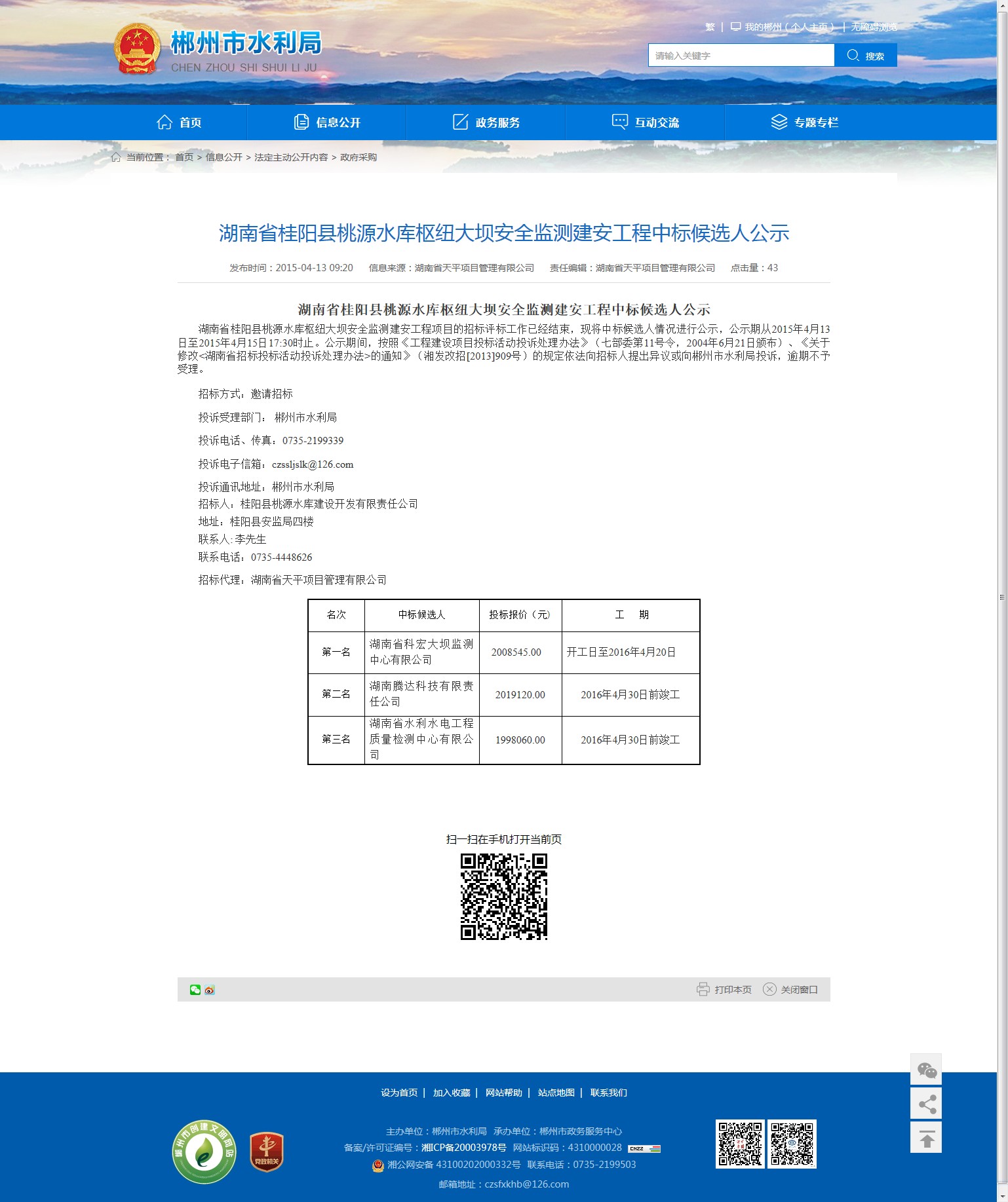 湖南省桂阳县桃源水库枢纽大坝安全监测建安工程中标候选人公示