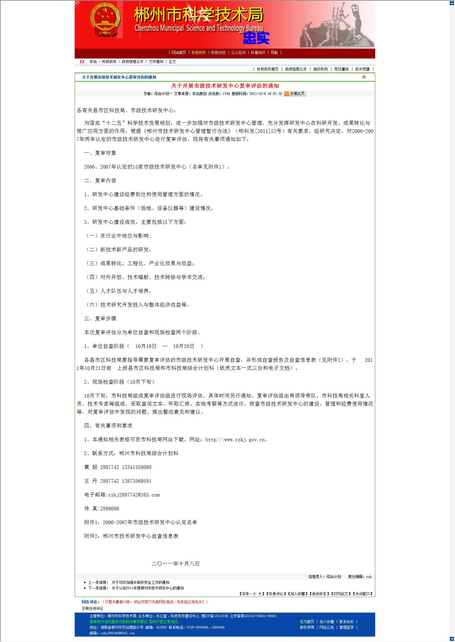 为落实“十二五”科学技术发展规划,进一步加强对市级技术研发中心管理,充分发挥研发中心在科研开发、成果转化与推广应用方面的作用,根据《郴州市技术研发中心管理暂行办法》(郴科发[2011]23号)有关要求,经研究决定,对2006-2007年两年认定的市级技术研发中心进行复审评估。现将有关事项通知如下: