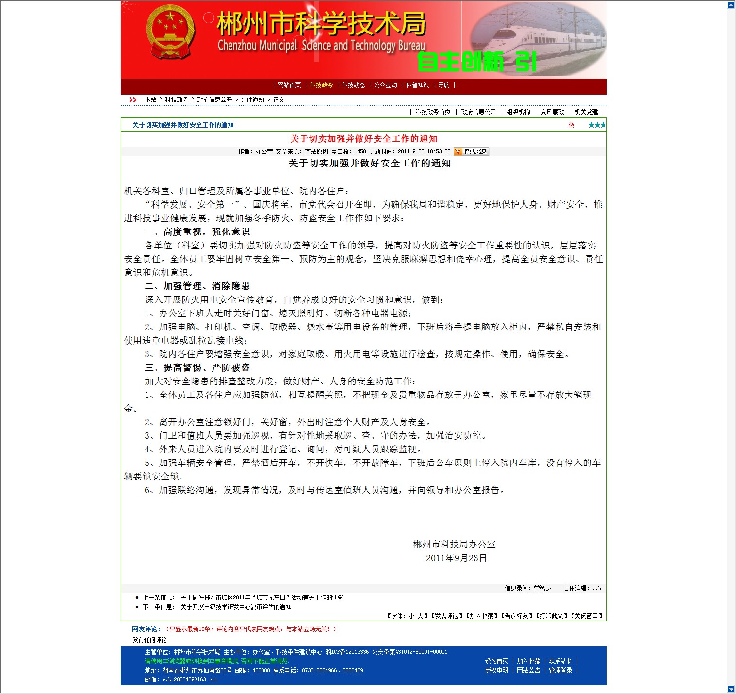 “科学发展、安全第一”。国庆将至,市党代会召开在即,为确保我局和谐稳定,更好地保护人身、财产安全,推进科技事业健康发展,现就加强冬季防火、防盗安全工作作如下要求: