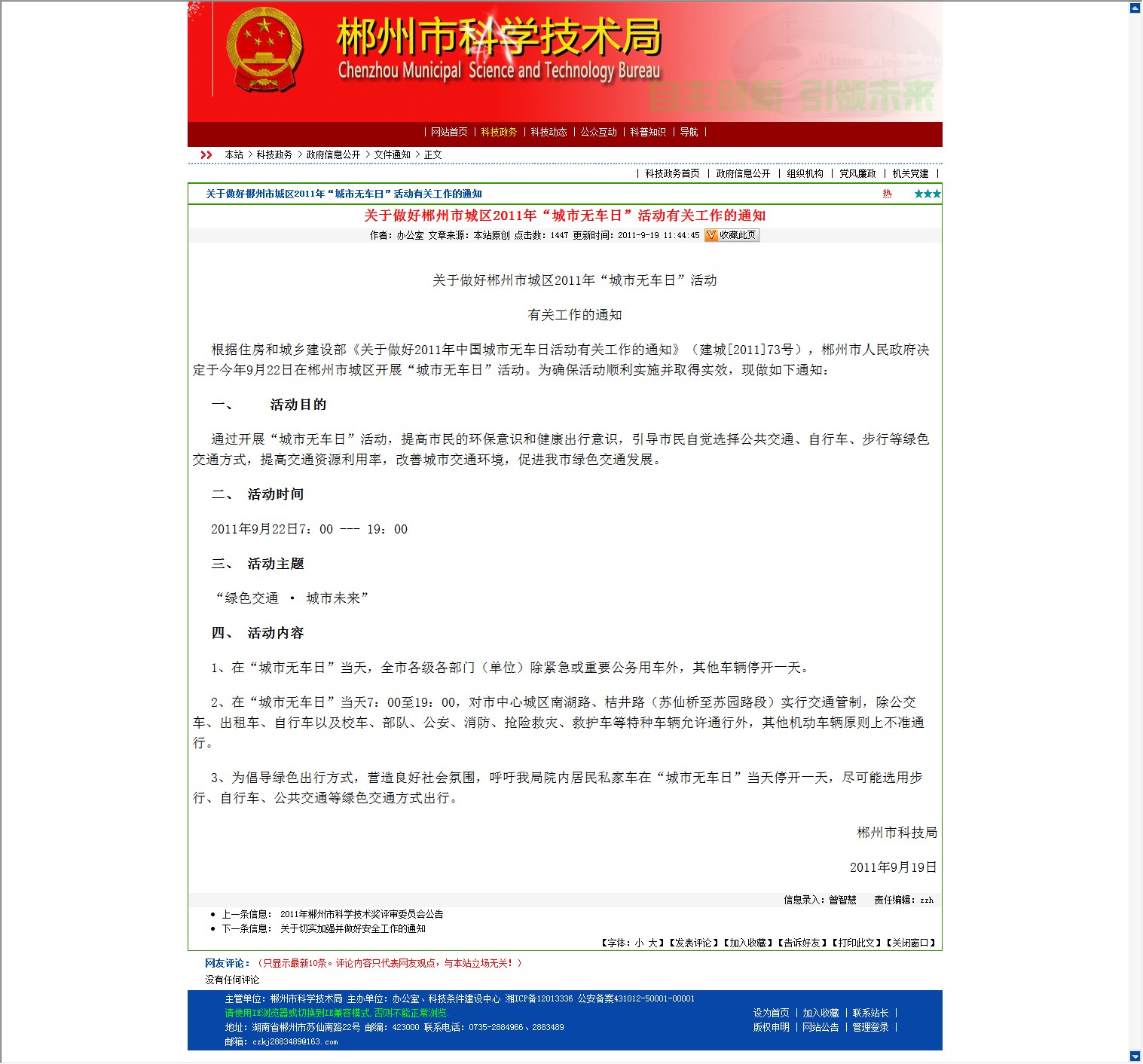 根据住房和城乡建设部《关于做好2011年中国城市无车日活动有关工作的通知》(建城[2011]73号),郴州市人民政府决定于今年9月22日在郴州市城区开展“城市无车日”活动。为确保活动顺利实施并取得实效,现做如下通知: