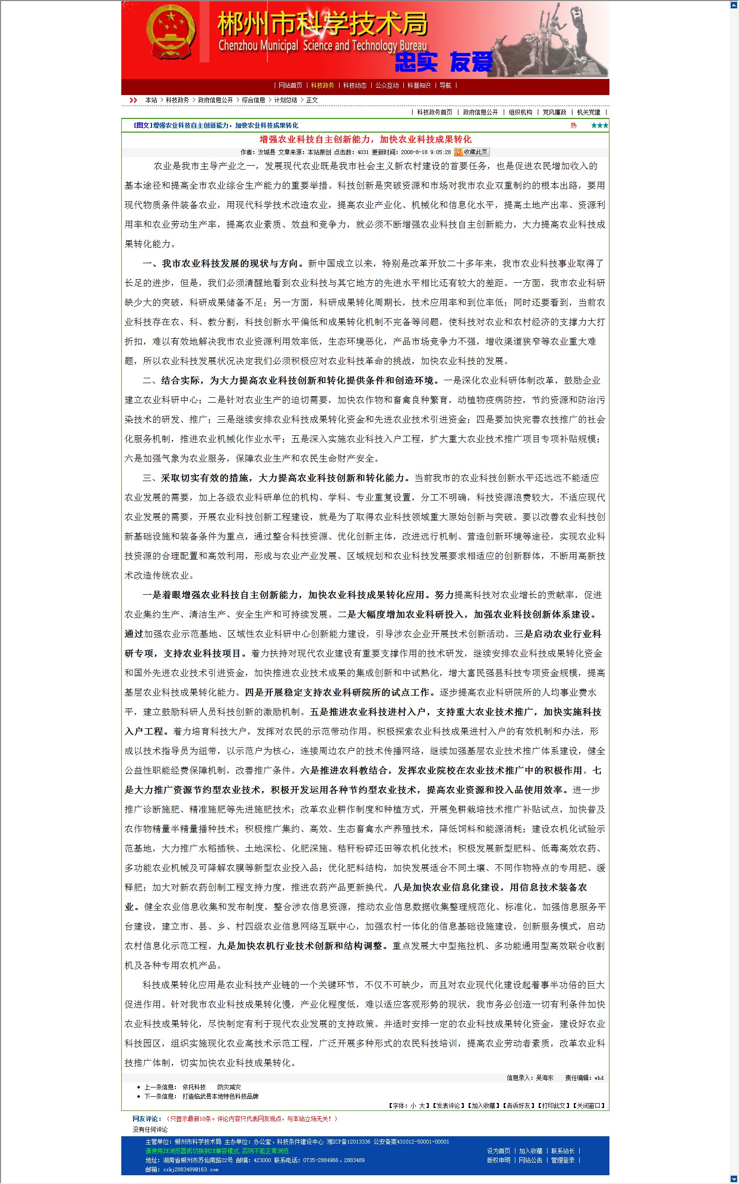 农业是我市主导产业之一,发展现代农业既是我市社会主义新农村建设的首要任务,也是促进农民增加收入的基本途径和提高全市农业综合生产能力的重要举措。科技创新是突破资源和市场对我市农业双重制约的根本出路,要用现代物质条件装备农业,用现代科学技术改造农业,提高农业产业化、机械化和信息化水平,提高土地产出率、资源利用率和农业劳动生产率,提高农业素质、效益和竞争力,就必须不断增强农业科技自主创新能力,大力提高农业科技成果转化能力。