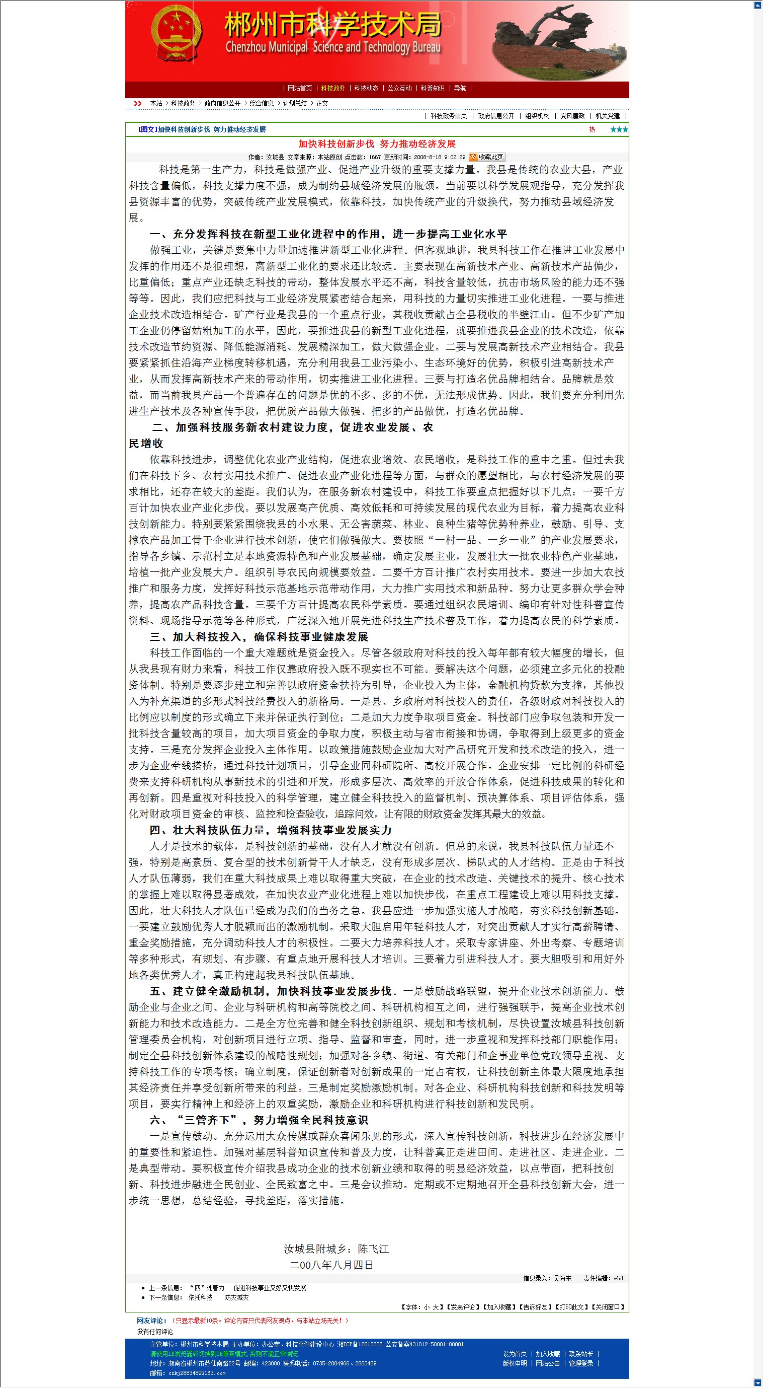 五、建立健全激励机制,加快科技事业发展步伐。一是鼓励战略联盟,提升企业技术创新能力。鼓励企业与企业之间、企业与科研机构和高等院校之间、科研机构相互之间,进行强强联手,提高企业技术创新能力和技术改造能力。二是全方位完善和健全科技创新组织、规划和考核机制,尽快设置汝城县科技创新管理委员会机构,对创新项目进行立项、指导、监督和审查,同时,进一步重视和发挥科技部门职能作用;制定全县科技创新体系建设的战略性规划;加强对各乡镇、街道、有关部门和企事业单位党政领导重视、支持科技工作的专项考核;确立制度,保证创新者对创新成果的一定占有权,让科技创新主体最大限度地承担其经济责任并享受创新所带来的利益。三是制定奖励激励机制。对各企业、科研机构科技创新和科技发明等项目,要实行精神上和经济上的双重奖励,激励企业和科研机构进行科技创新和发民明。