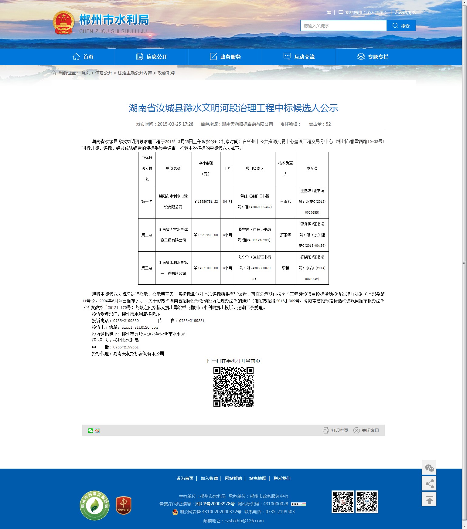 现将中标候选人情况进行公示,公示期三天,各投标单位对本次评标结果有异议者,可在公示期内按照《工程建设项目投标活动投诉处理办法》(七部委第11号令,2004年6月21日颁布)、《关于修改《湖南省招标投标活动投诉处理办法》的通知(湘发改招【2013】909号、《湖南省招标投标活动违规问题举报办法》(湘发改招〔2012〕179号)的规定向招标人提出异议或向郴州市水利局提出投诉,逾期不予受理。