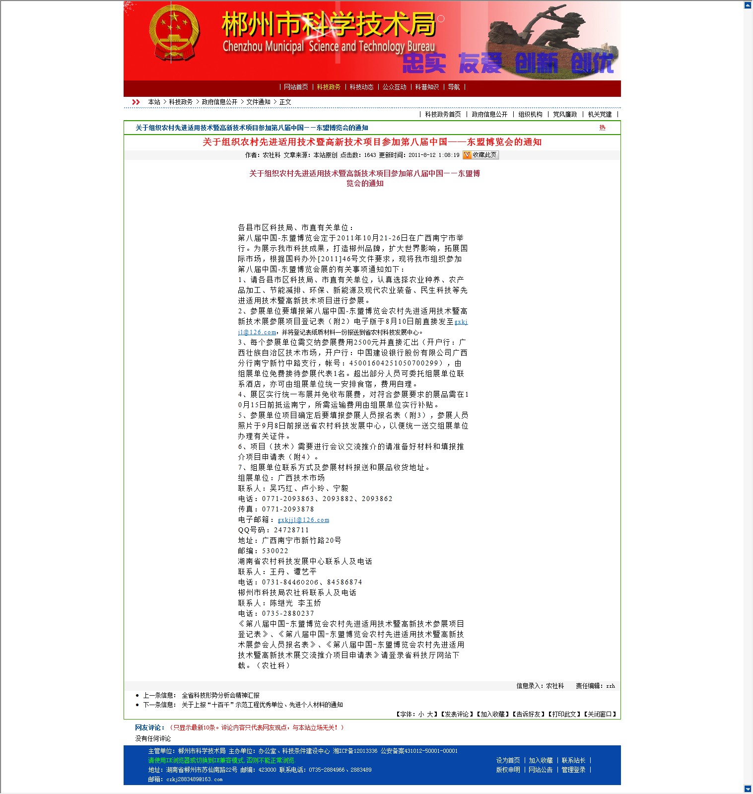 第八届中国-东盟博览会定于2011年10月21-26日在广西南宁市举行。为展示我市科技成果,打造郴州品牌,扩大世界影响,拓展国际市场,根据国科办外[2011]46号文件要求,现将我市组织参加第八届中国-东盟博览会展的有关事项通知如下: