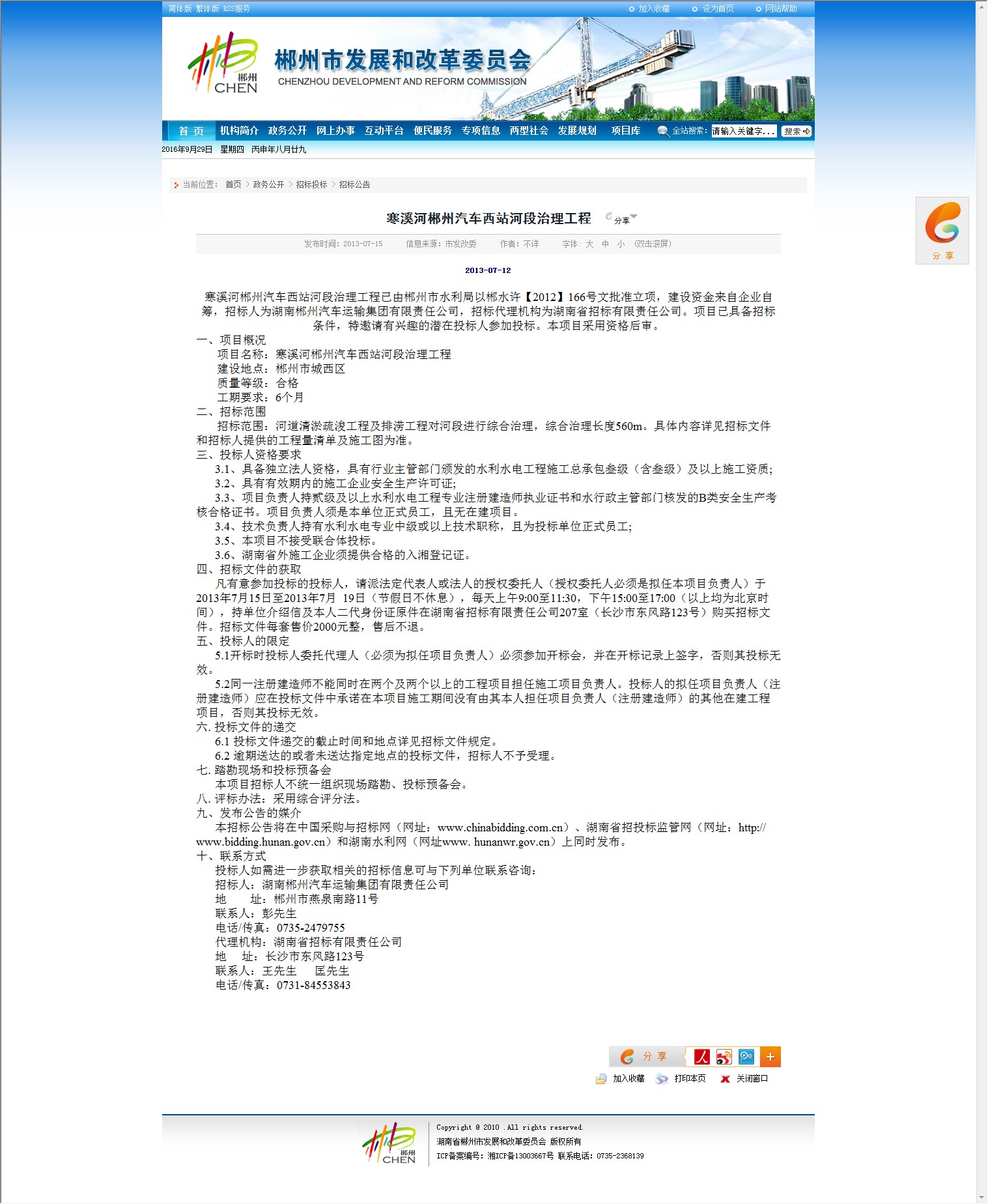 寒溪河郴州汽车西站河段治理工程已由郴州市水利局以郴水许【2012】166号文批准立项,建设资金来自企业自筹,招标人为湖南郴州汽车运输集团有限责任公司,招标代理机构为湖南省招标有限责任公司。项目已具备招标条件,特邀请有兴趣的潜在投标人参加投标。本项目采用资格后审。