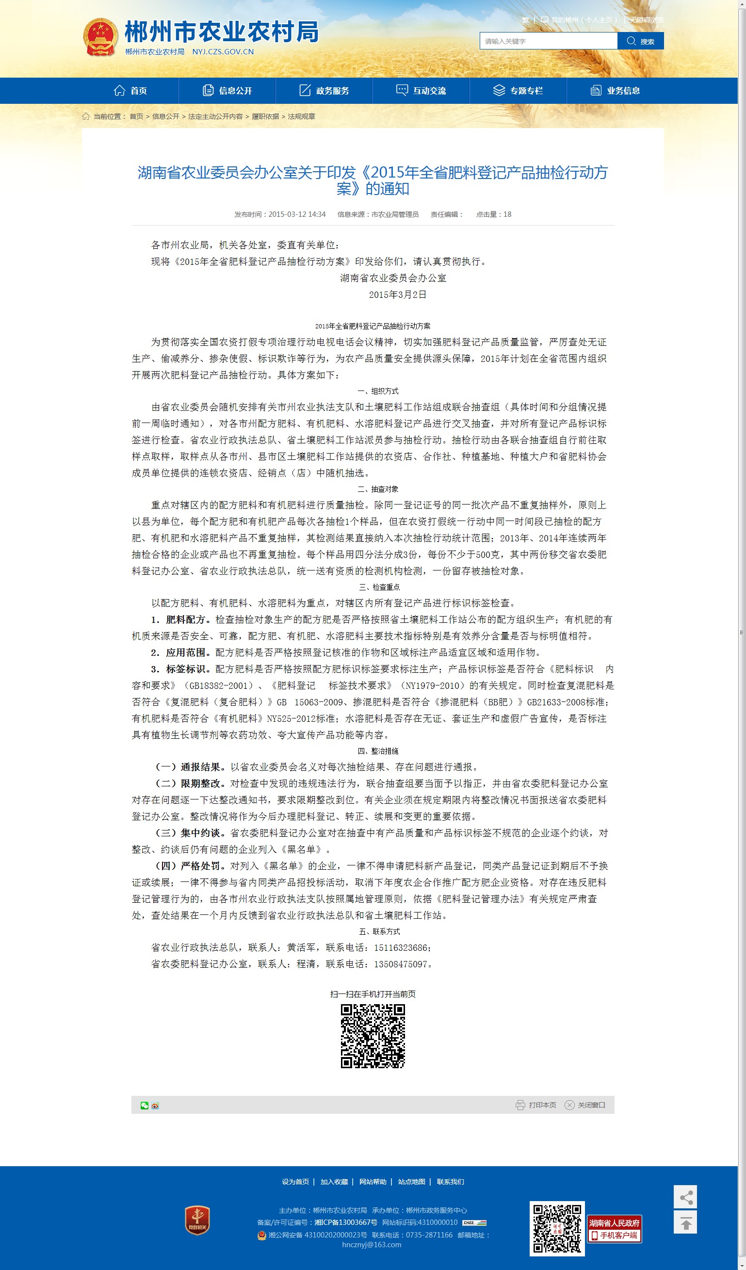 为贯彻落实全国农资打假专项治理行动电视电话会议精神,切实加强肥料登记产品质量监管,严厉查处无证生产、偷减养分、掺杂使假、标识欺诈等行为,为农产品质量安全提供源头保障,2015年计划在全省范围内组织开展两次肥料登记产品抽检行动。具体方案如下: