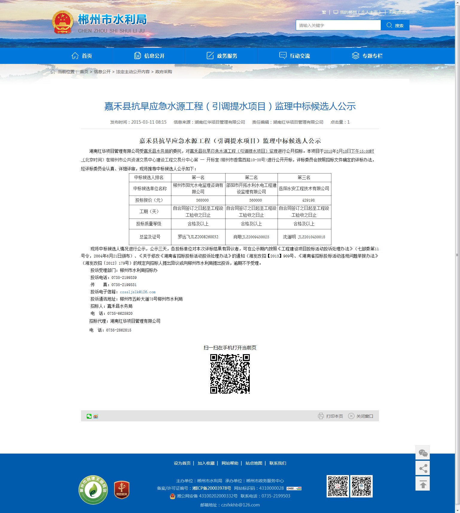 现将中标候选人情况进行公示,公示三天,各投标单位对本次评标结果有异议者,可在公示期内按照《工程建设项目投标活动投诉处理办法》(七部委第11号令,2004年6月21日颁布)、《关于修改《湖南省招标投标活动投诉处理办法》的通知(湘发改招【2013】909号、《湖南省招标投标活动违规问题举报办法》(湘发改招〔2012〕179号)的规定向招标人提出异议或向郴州市水利局提出投诉,逾期不予受理。