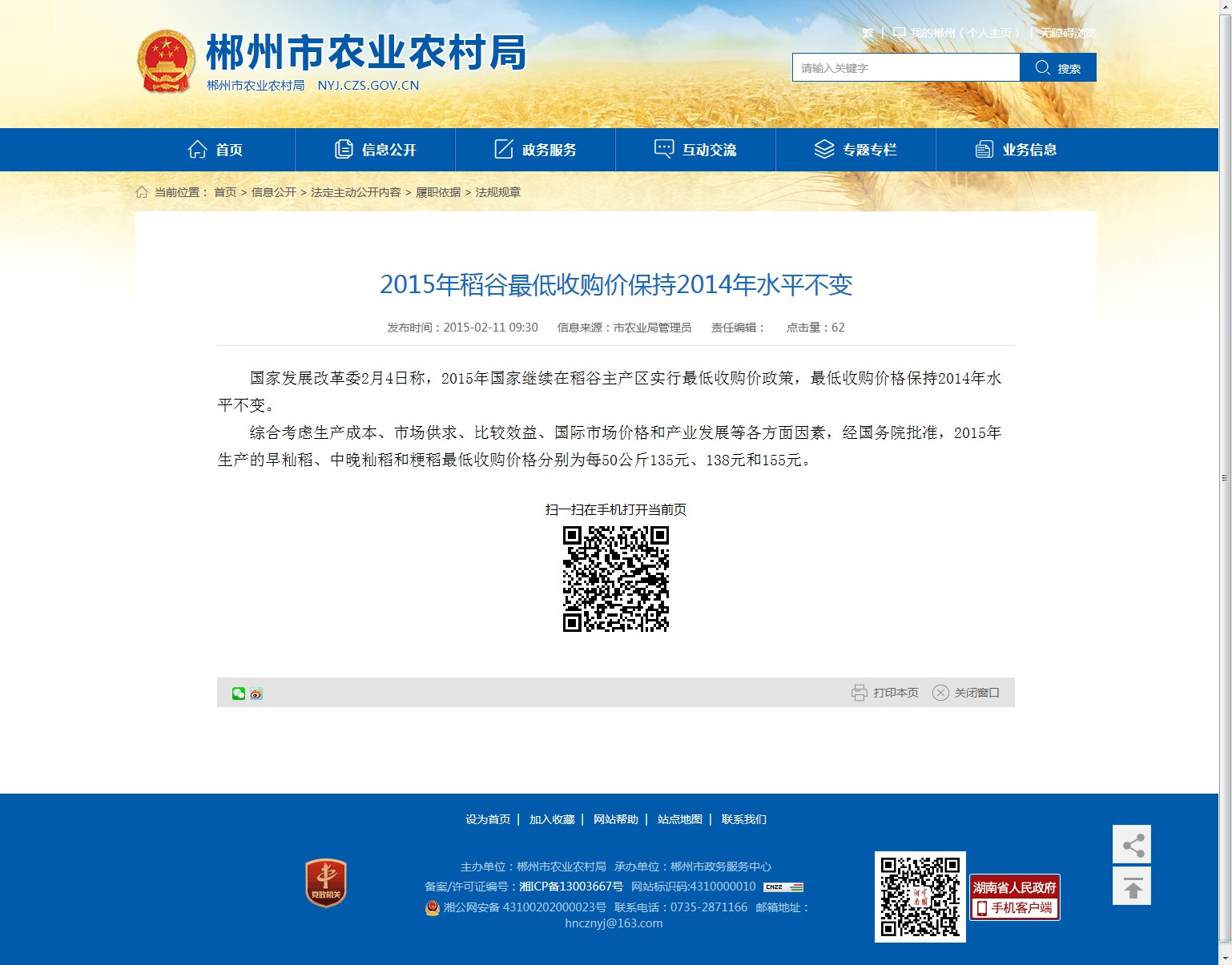 国家发展改革委2月4日称,2015年国家继续在稻谷主产区实行最低收购价政策,最低收购价格保持2014年水平不变。