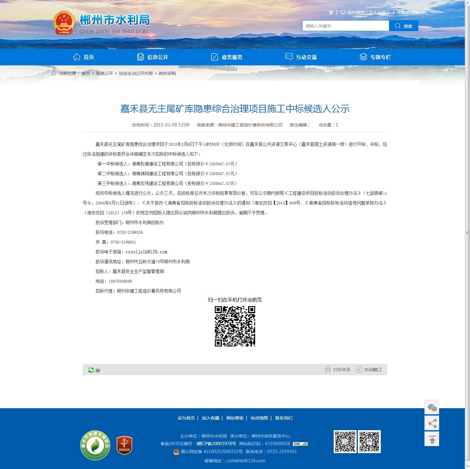 投诉受理部门:郴州市水利局招标办