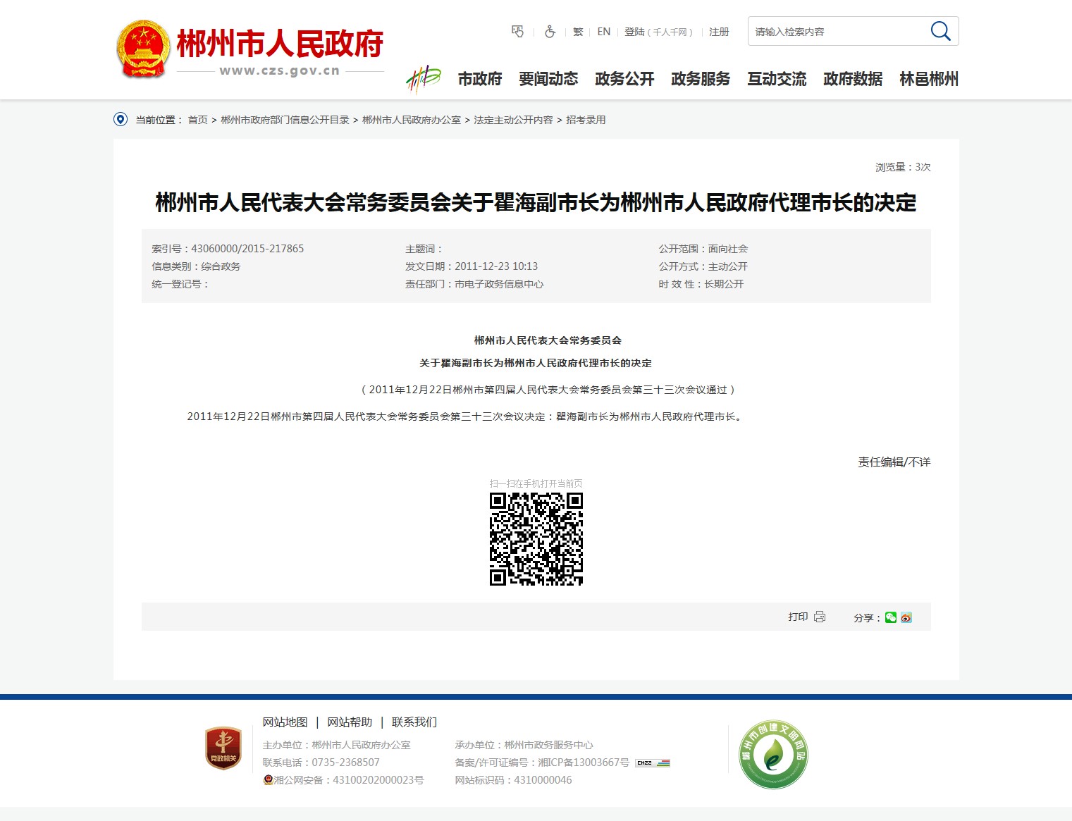 2011年12月22日郴州市第四届人民代表大会常务委员会第三十三次会议决定:瞿海副市长为郴州市人民政府代理市长。