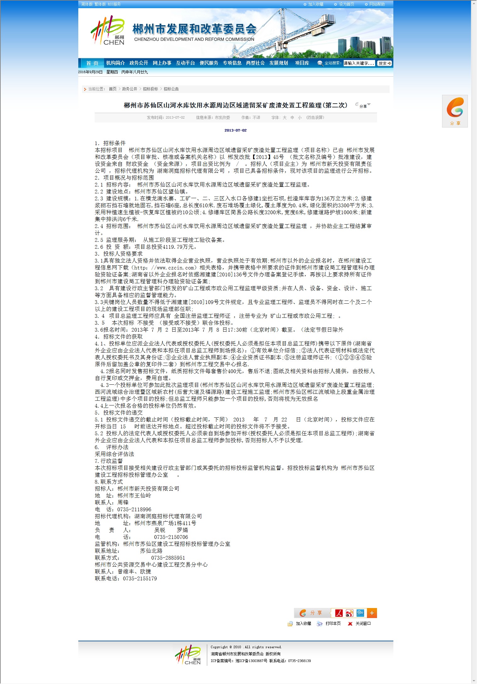 本招标项目 郴州市苏仙区山河水库饮用水源周边区域遗留采矿废渣处置工程监理(项目名称)已由 郴州市发展和改革委员会(项目审批、核准或备案机关名称)以 郴发改批【2013】45号 (批文名称及编号)批准建设,建设资金来自 财政资金 (资金来源),项目出资比例为 / 。招标人(项目业主)为 郴州市新天投资有限责任公司 ,招标代理机构为 湖南洞庭招标代理有限公司 ,项目已具备招标条件,现对该项目的监理进行公开招标。
